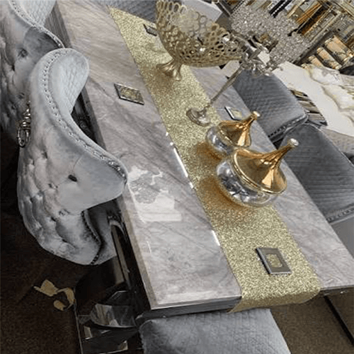 Grey Patterned Velvet and Chrome Round Storage Stool