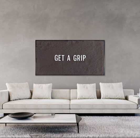 GET A GRIP - WHITE 3D TEXT ON ESPRESSO