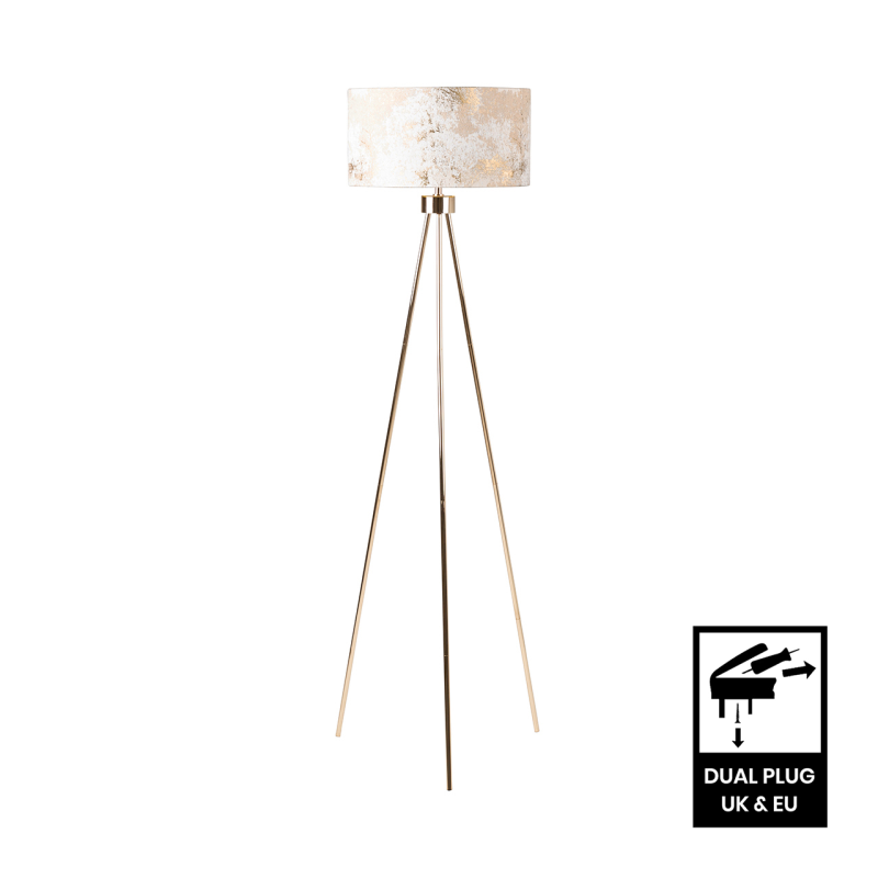 Standing elegantly on three gold legs that are bound together with a metallic ring, this tripod lamp is sophisticated and slender. With the addition of the chic ivory linen lampshade lined in gold, this will provide a versatile and modern lighting feature in your home... All you have to do is plug it in where you want it and you're done.Also available in 63cm table lamp version for classy co-ordination.