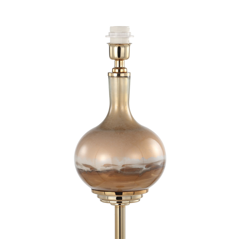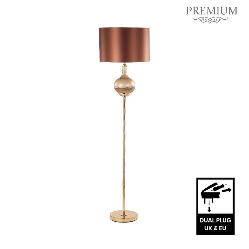 This floor lamp features a beautiful two-tone brown glass base that adds a touch of elegance to any space. The contrasting shades of brown create a captivating visual effect, enhancing the lamp's aesthetic appeal. The dark brown satin silk shade exudes a luxurious and refined ambiance, perfectly complementing the golden accents found throughout the lamp and equipped with an E27 dual plug.