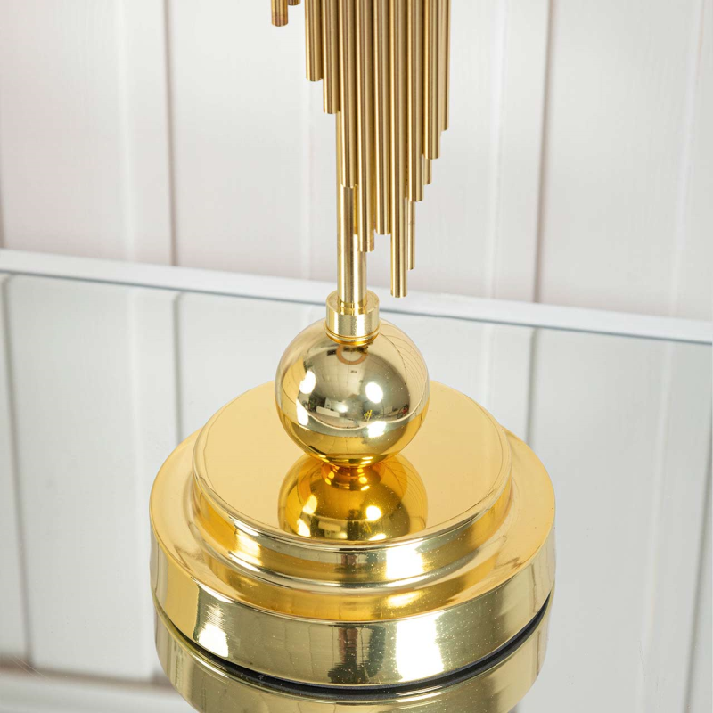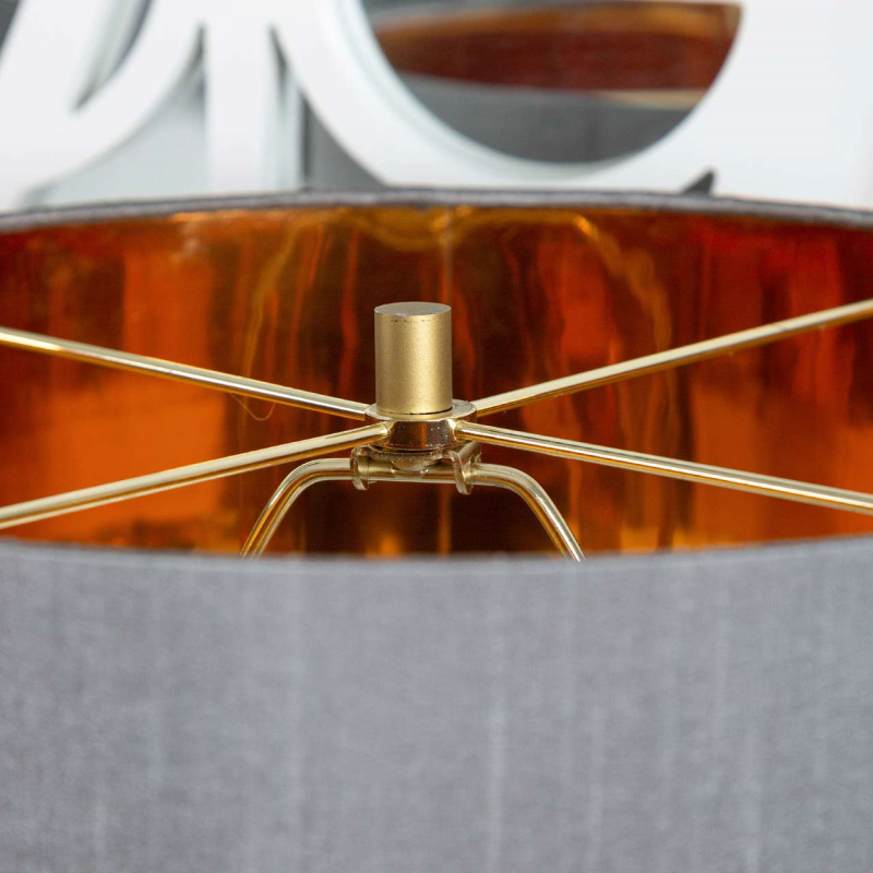 A beautifully decorated pre-assembled lamp with grey shade. The stand has a beautiful lines pattern, giving more beauty to its abstract look. It has a golden base. A classy piece of art looking lamp, perfect for your home or office.