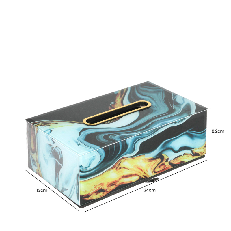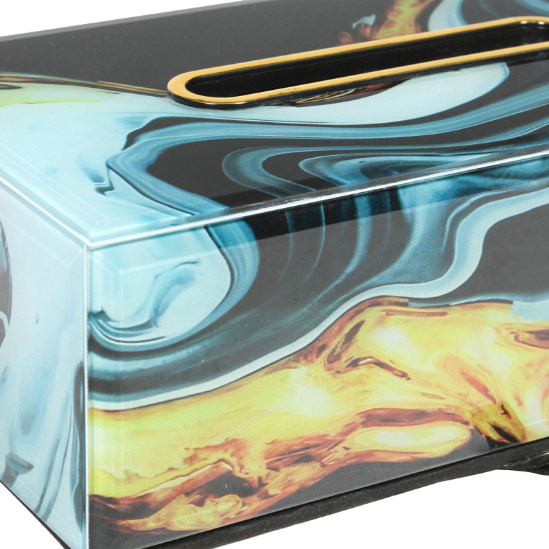 This tissue box holder features a captivating abstract design in bold shades of black and blue. The unique and eye-catching patterns create a dynamic visual impact, adding a contemporary and artistic touch to any room. Crafted with attention to detail, this tissue box holder is not only functional but also serves as a decorative piece. It fits standard-sized tissue boxes, providing a convenient and stylish way to keep your tissues within reach. The black and blue color combination adds a sleek and modern element to your space