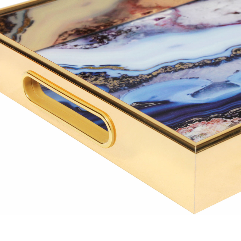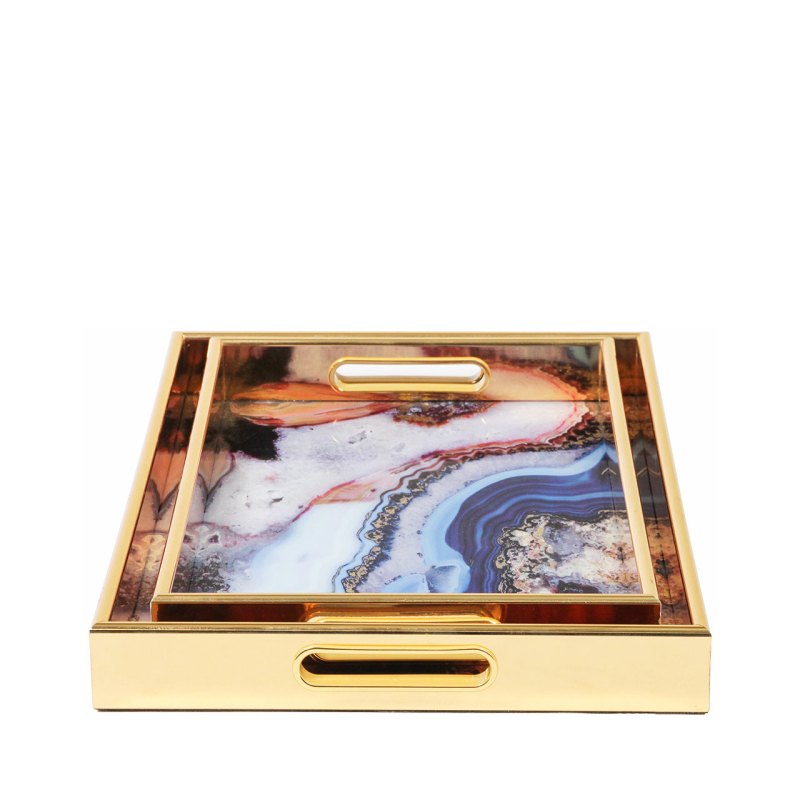 Crafted with precision and care, these trays feature a high-quality construction that ensures durability and longevity. The smooth and glossy surface provides a perfect platform for serving drinks, displaying decorative items, or organizing your belongings in style. This set includes two trays, each showcasing a stunning agate design in mesmerizing shades of blue and accentuated with touches of gold. The intricate details and vibrant colors of the agate design make these trays a true work of art, adding elegance and sophistication to any space.