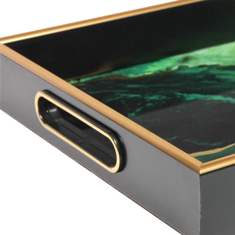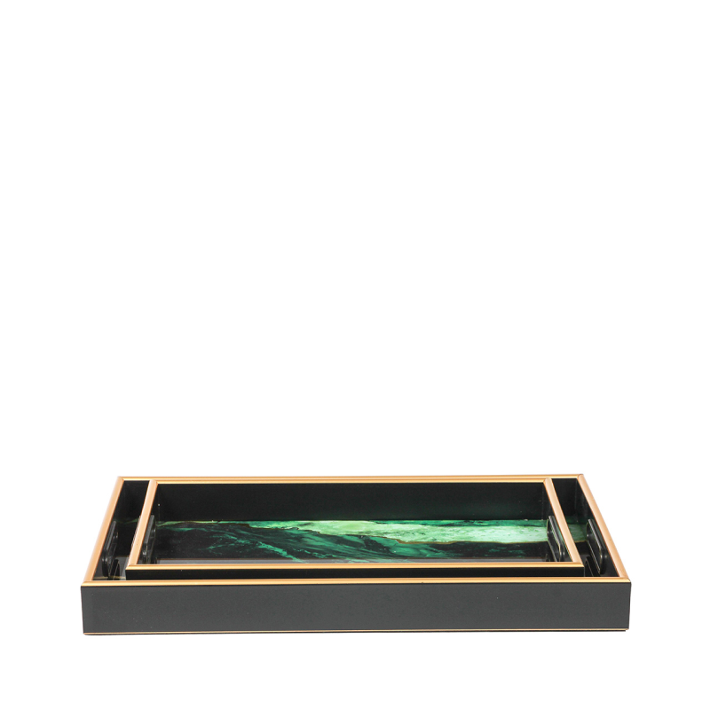 Crafted with attention to detail, these trays are built to withstand everyday use while exuding a sense of opulence. The smooth and glossy surface provides a perfect platform for serving drinks, displaying decorative items, or organizing your essentials in style. The harmonious blend of green and gold creates a visually stunning and sophisticated aesthetic. The trays seamlessly integrate into various decor styles, from contemporary to eclectic, adding a touch of luxury and refinement to your living room, dining area, or bedroom.