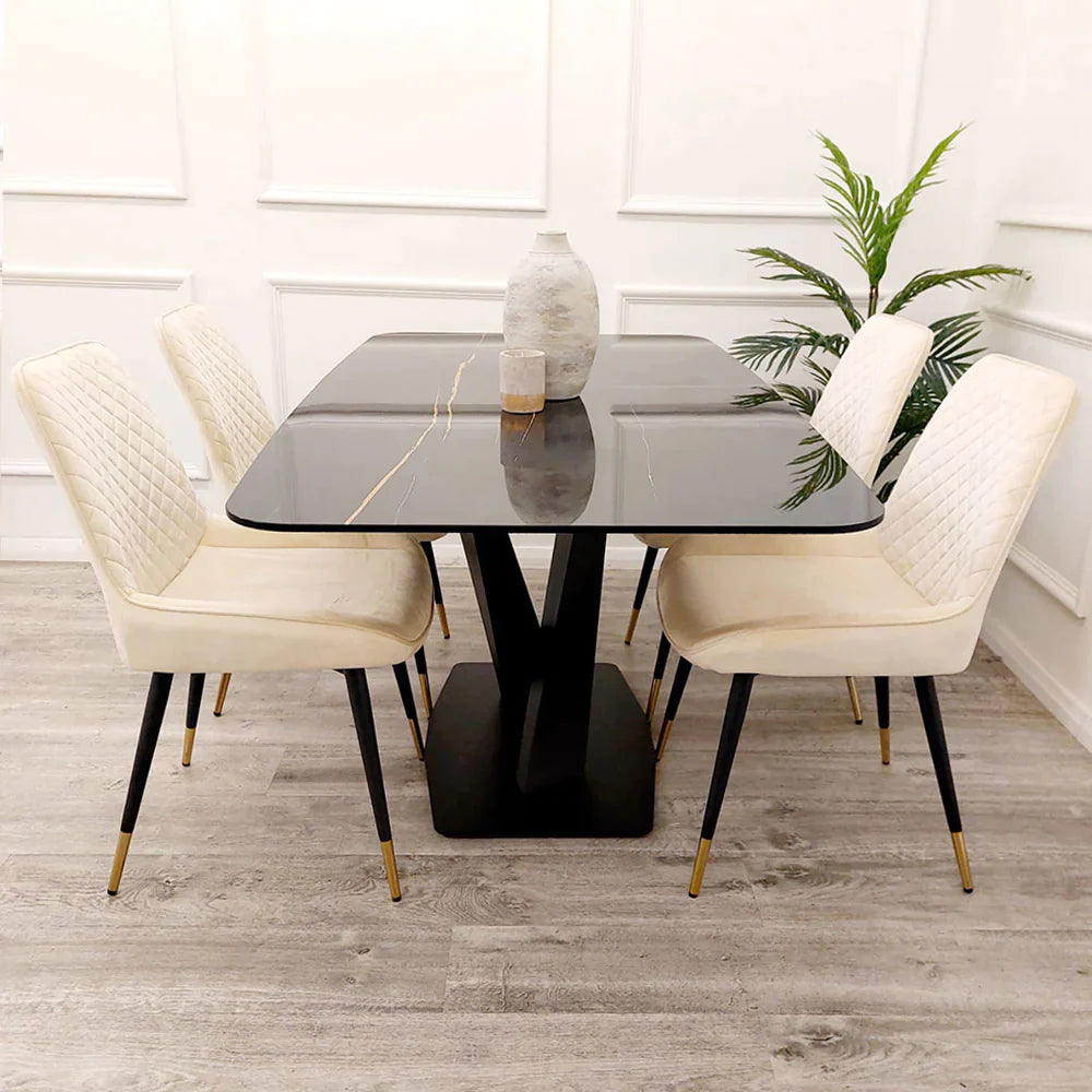 Our simple yet stylish Aplex 1.6 Dining Table features a stunning Black Sintered Stone top with a subtle mustard grain running through. A robust black cross over pedestal base completes the table making it ideal for approximately 4 to 6 chairs.