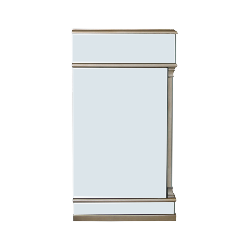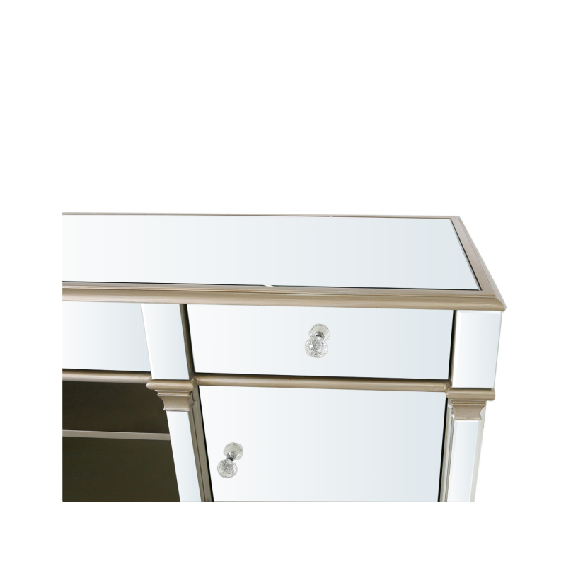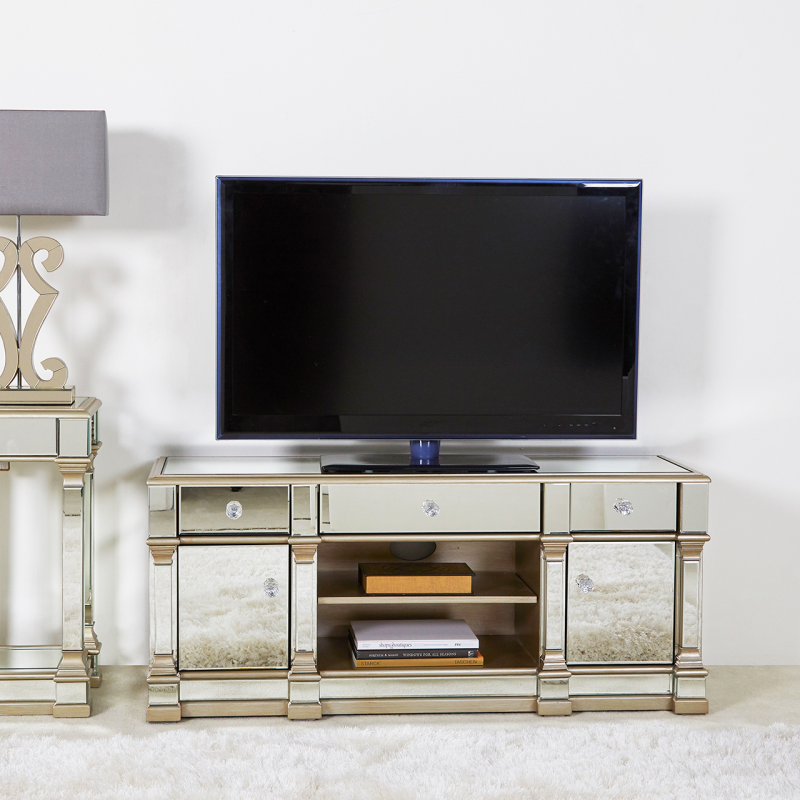 Bring your love of elegance to your living room with this beautiful Apollo TV entertainment unit. High fashion features include beautiful mirror paneling and felt-lined drawers which give this piece an opulent feel. Including crystal knobs, 3 storage drawers, 2 storage cabinets, 2 component shelves and a warm champagne trim to finish.