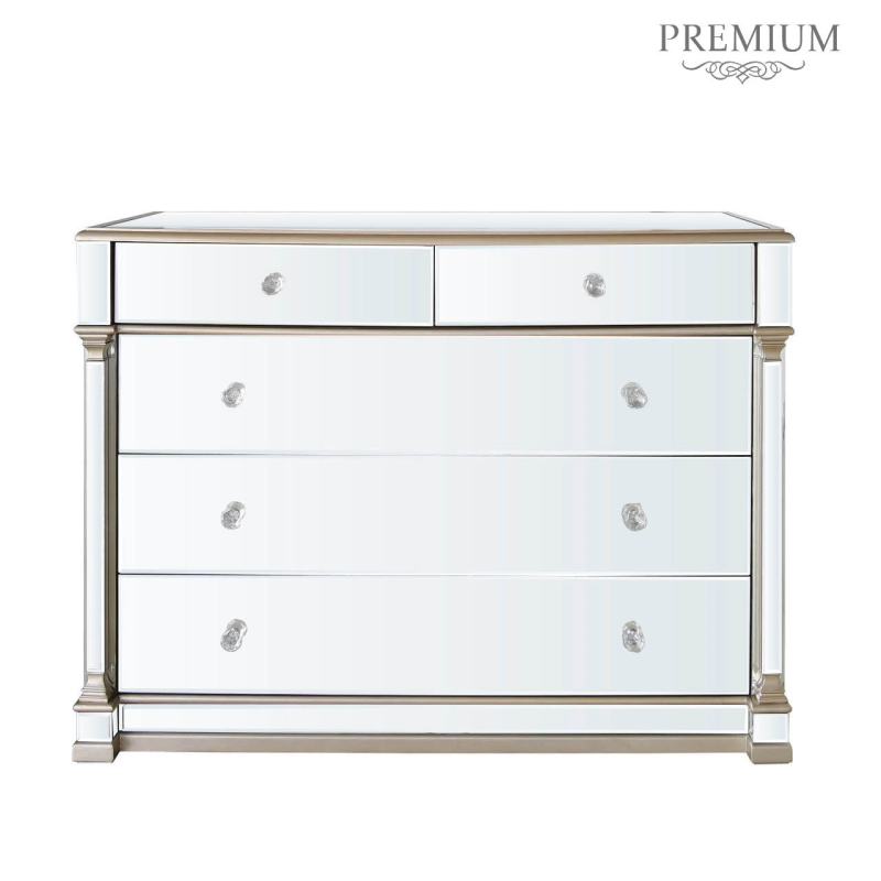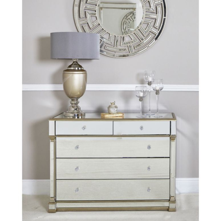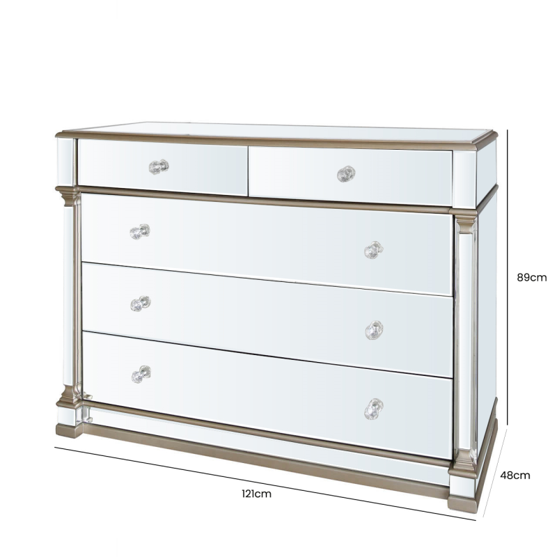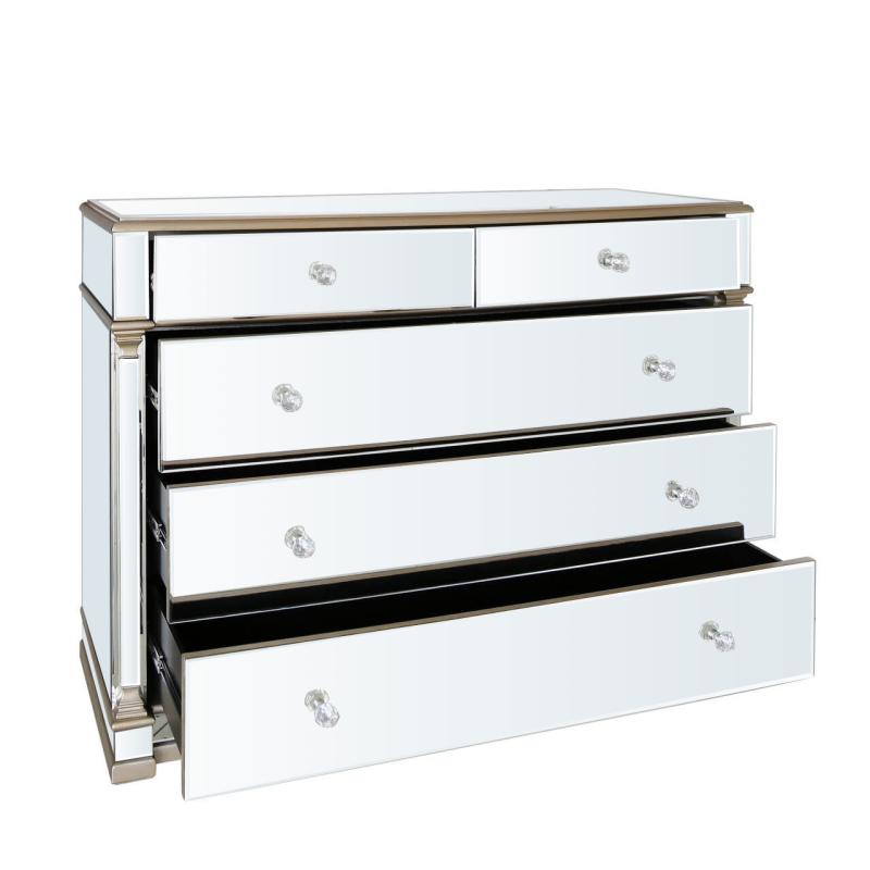 Complete your bedroom with the elegant Apollo 5 drawer chest featuring a champagne coloured trim, mirrored panels, spacious drawers that glide on metal runners and with sparkling crystal handles.