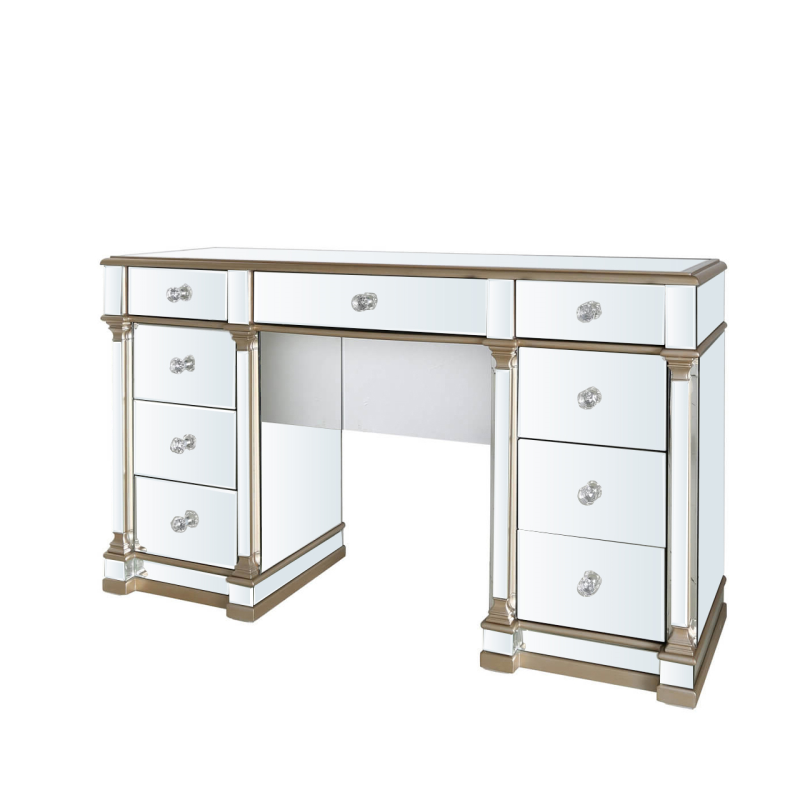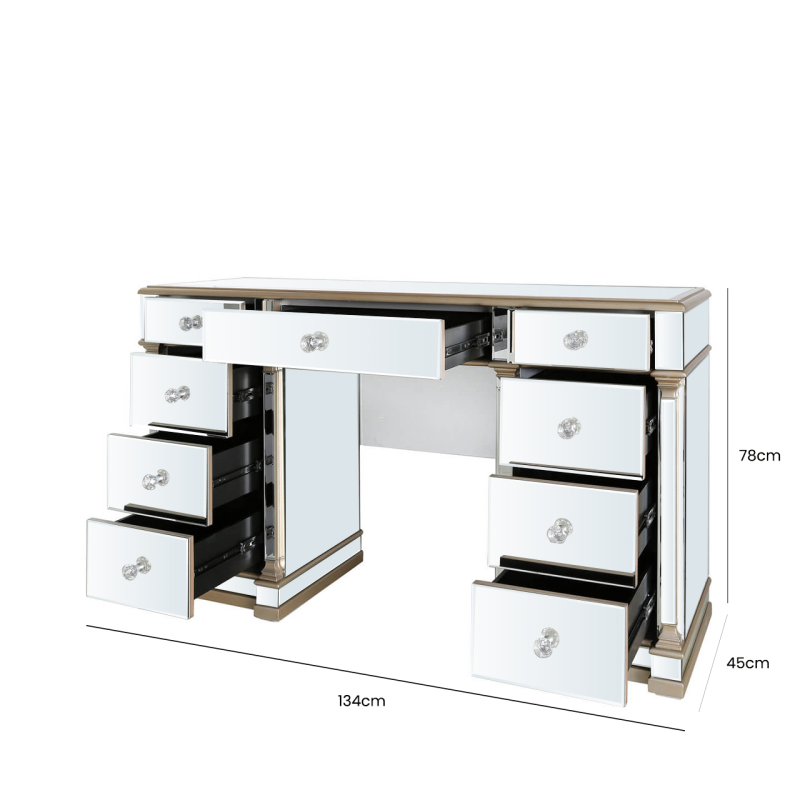 Complete your bedroom with the elegant Apollo 9 drawer dressing table featuring a champagne coloured trim, mirrored panels, spacious drawers that glide on metal runners and with sparkling crystal handles .