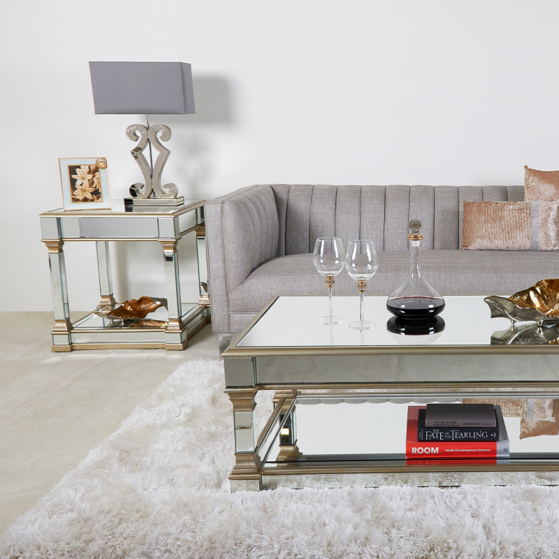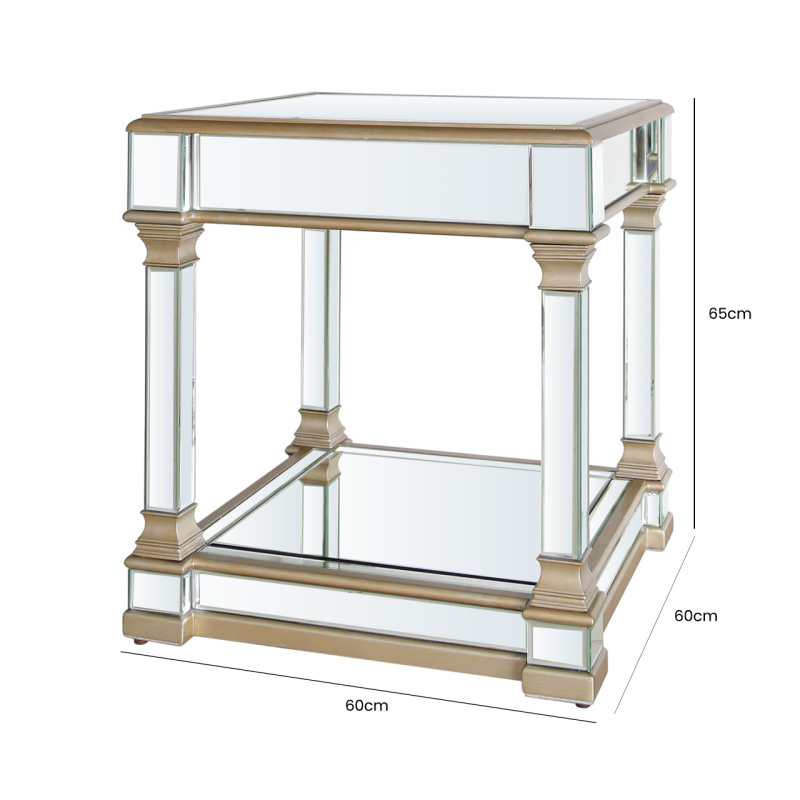 Fill an empty corner with the glamorous Apollo end table, featuring a mirrored table finished with a champagne trim.