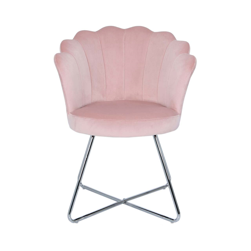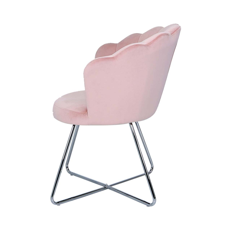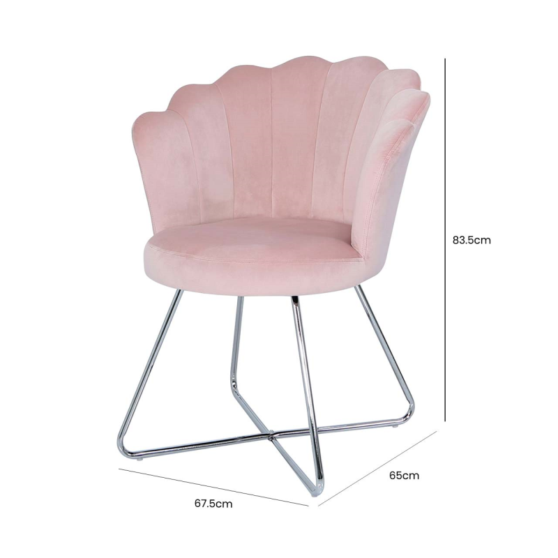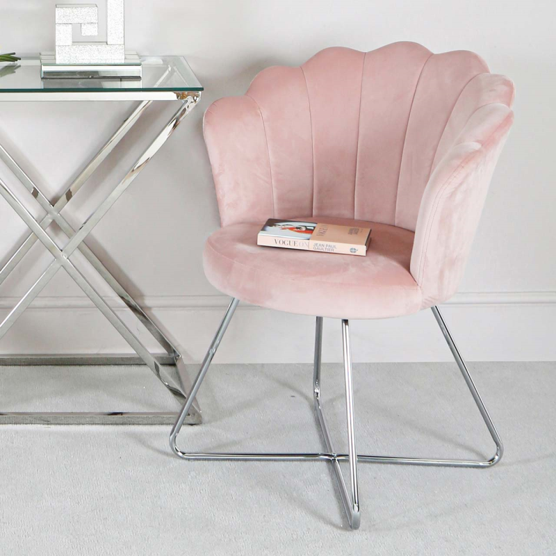 This lavish Ariel pink velvet dining chair is sure to grab attention in your home. The chrome finished legs hold up the mustard velvet seat which is styled similar to a shell. Ideal for dining, dressing table or as an occassional chair