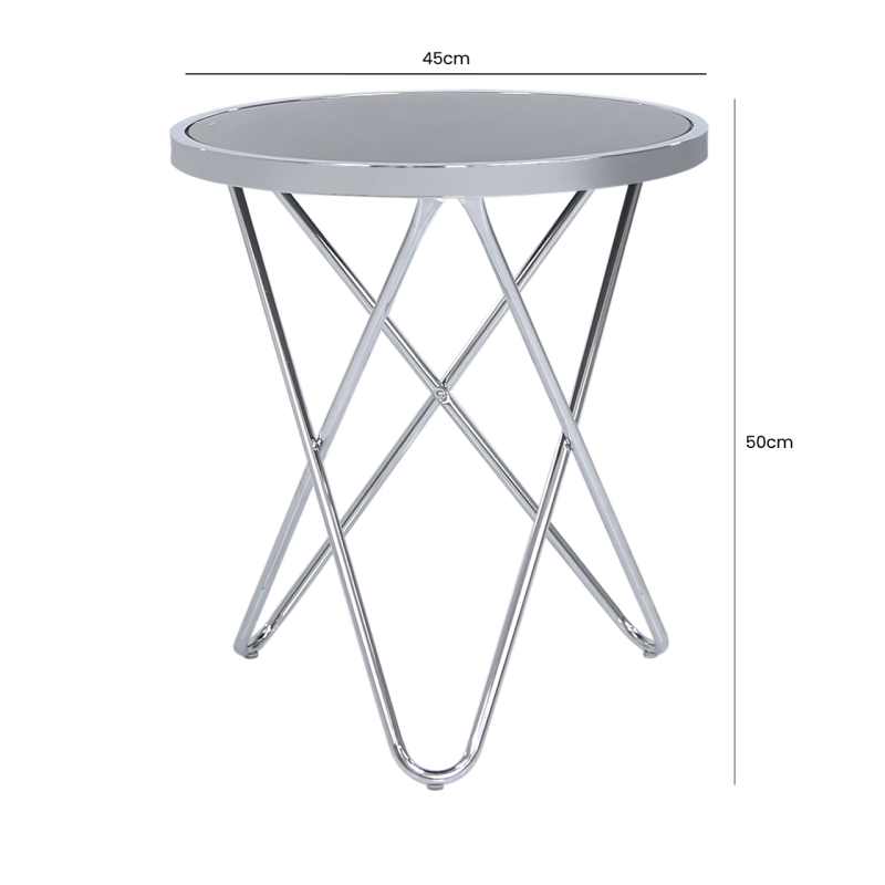 Featuring a crisscross designed base, the Atom end table will bring a chic contemporary look to any room. Featuring a chrome base with a black glass table top it would also be perfect as lamp/sofa/bedside/display/occasional table.