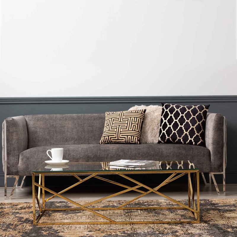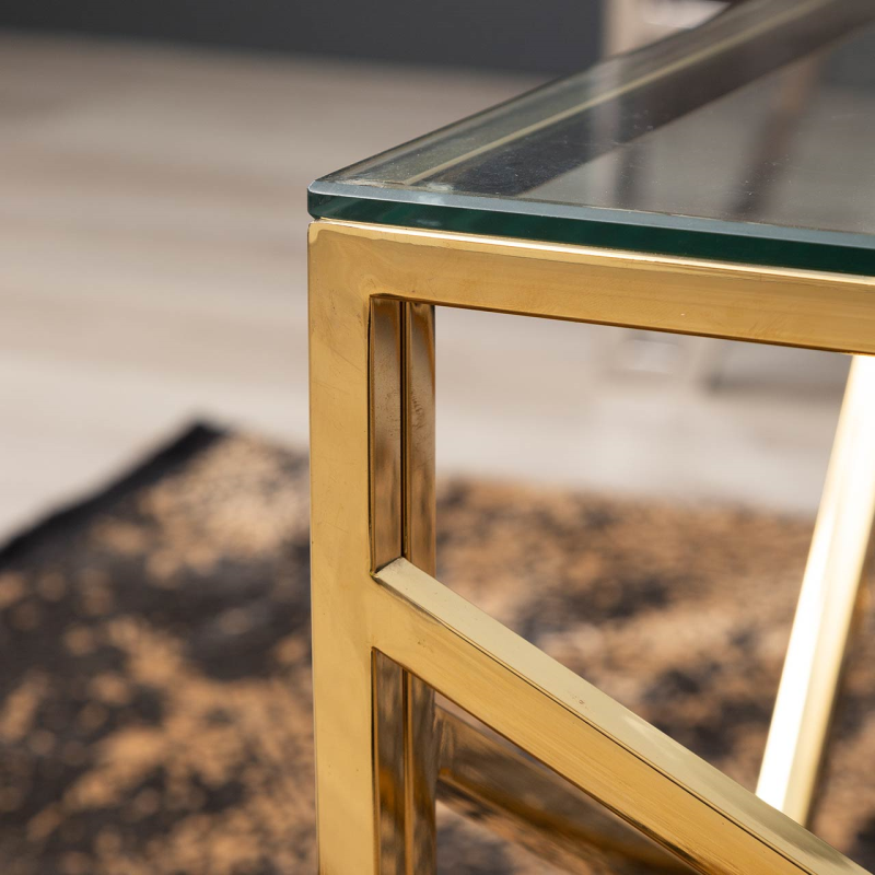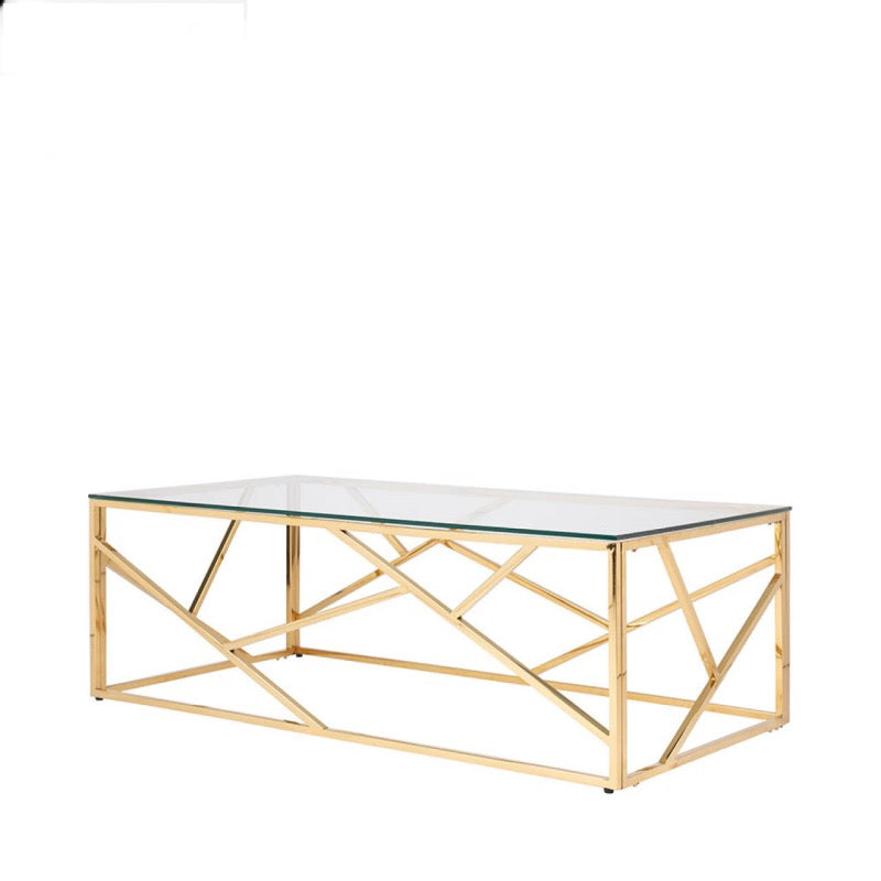 Uniquely crafted metal coffee table for your living room or hallway with gold finished legs and a geometric patterned metal base, a clear tempered glass top. the design which will fit in any decor style. The Zaria coffee table is sure to be a standout piece in any living room