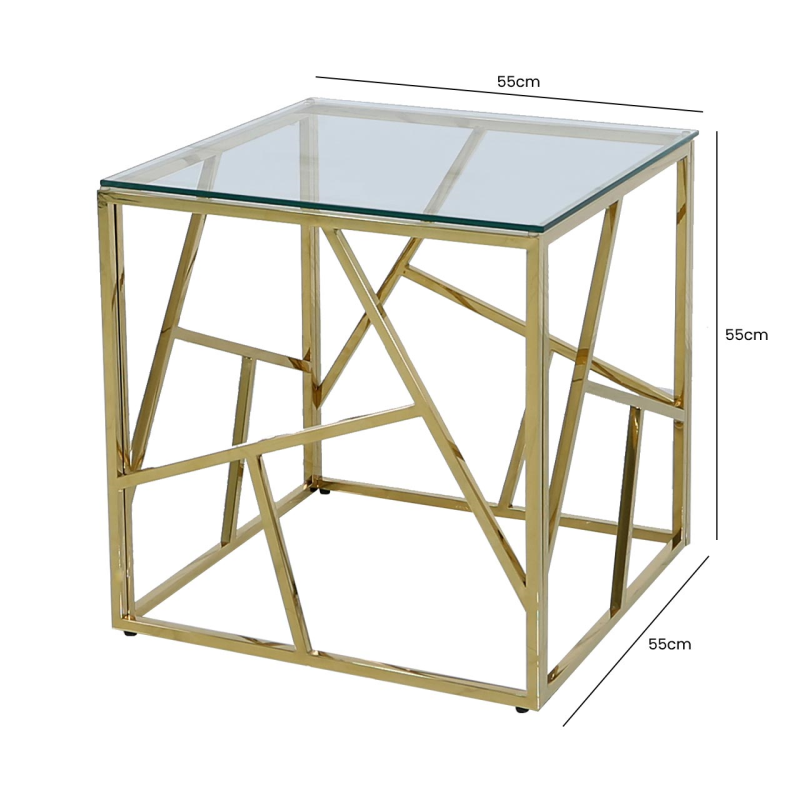 The Azaria end table has a geometric modern style design with a gold finished stainless steel construction for a sleek aesthetic. Ideal for use beside the sofa or bed in the living room or bedroom. Table lamps, flower vases, beautiful ornaments, and other items can be placed here.