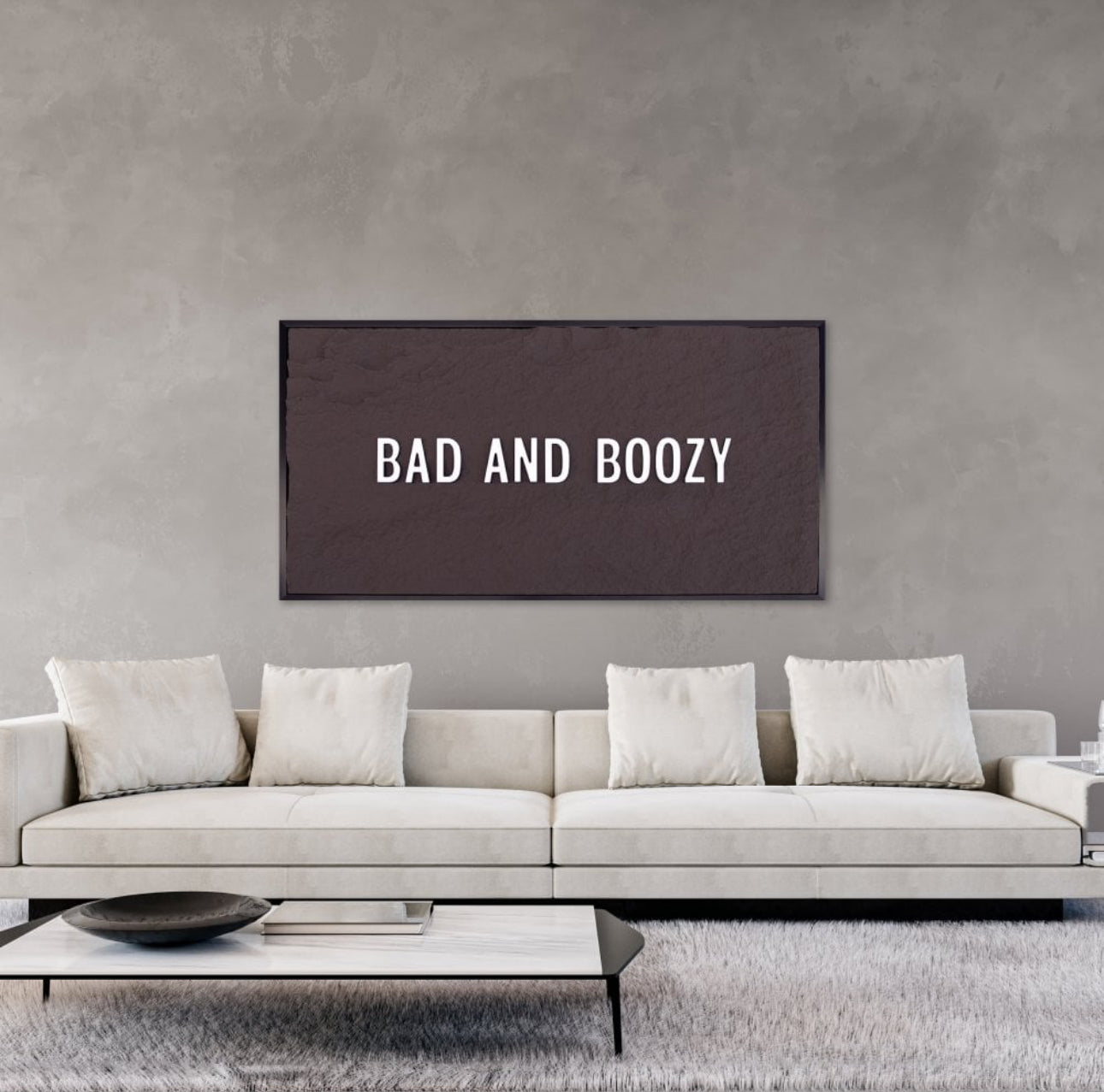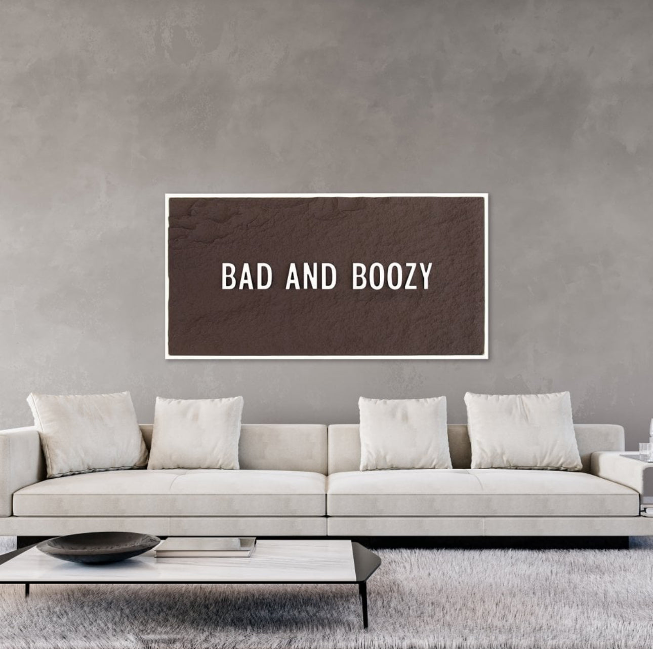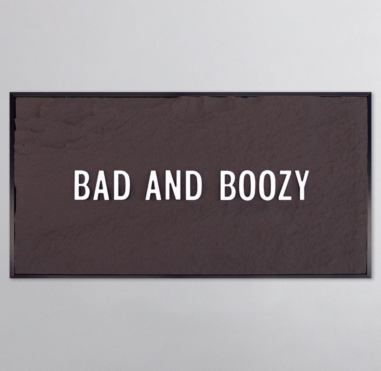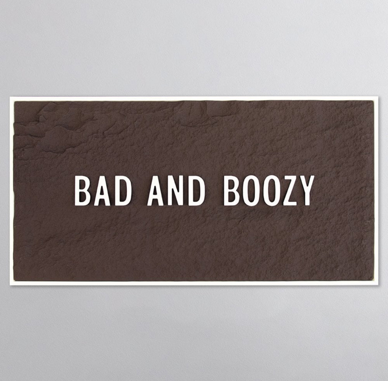 BAD & BOOZY - WHITE 3D TEXT ON ESPRESSO