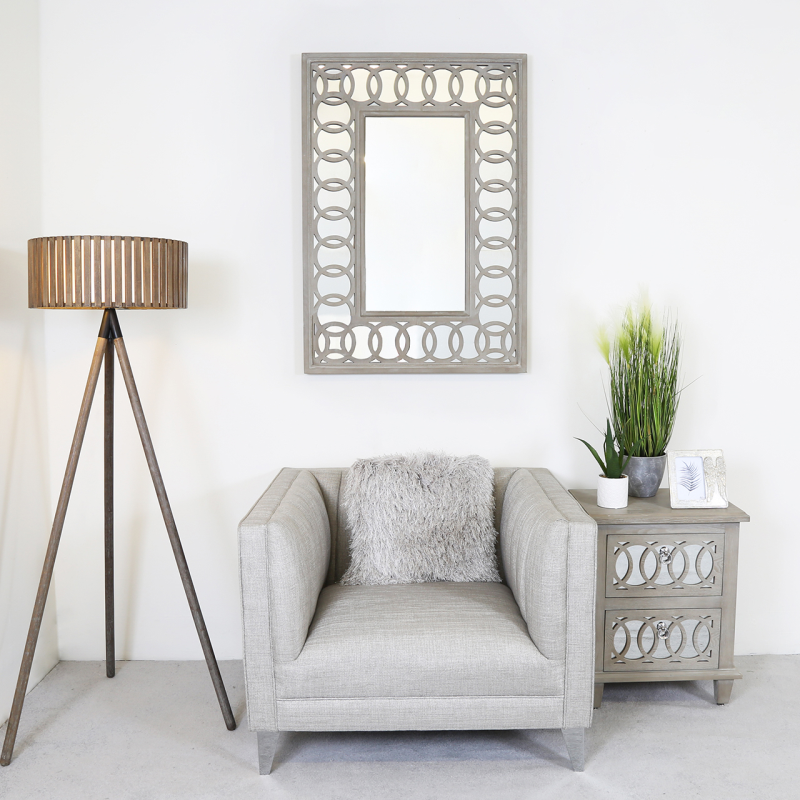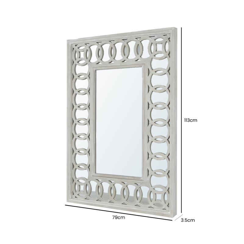 The rectanglular Bayview wall mirror is crafted from high quality natural wood with an intricate overlapping circular design with clear mirror insets.