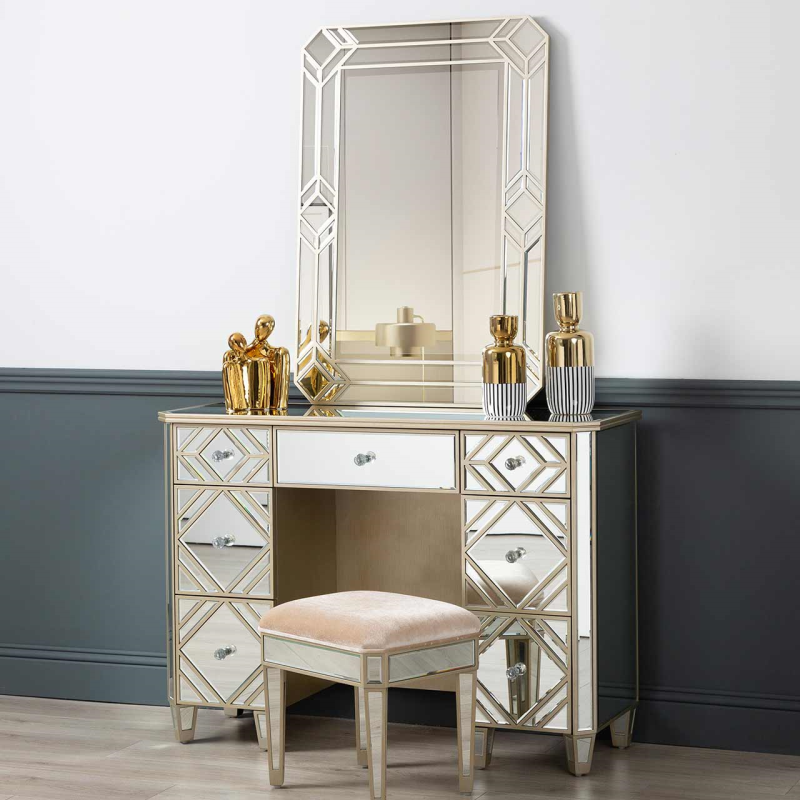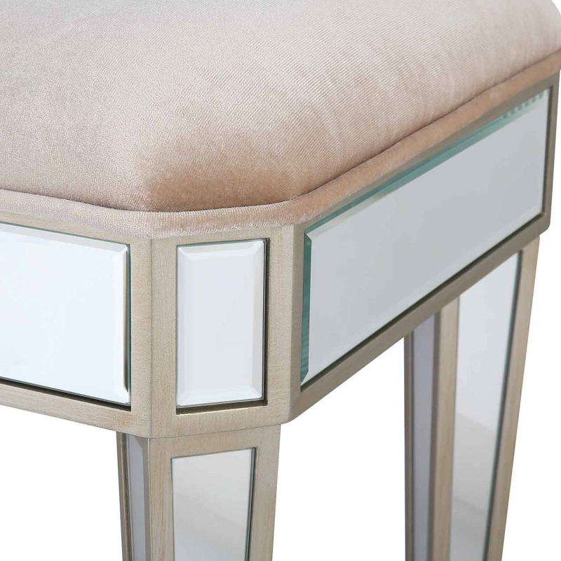 Bring sumptuous sophistication to your decor with our deco-inspired Becca mirror and champagne stool. It features a soft champagne faux velvet cushion for additional comfort and a luxurious look.