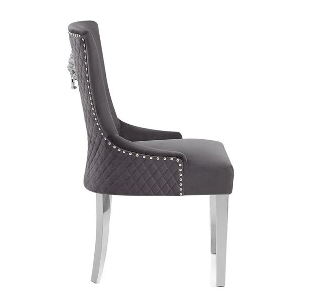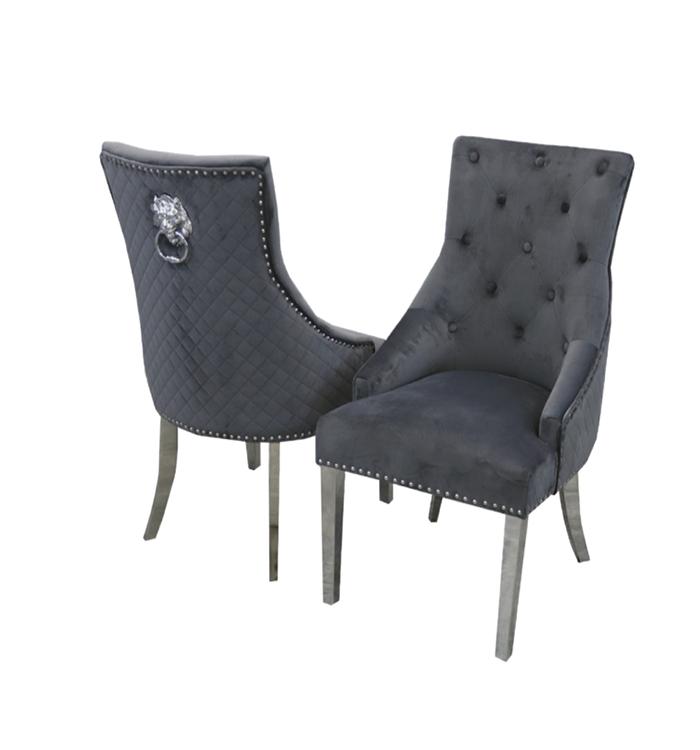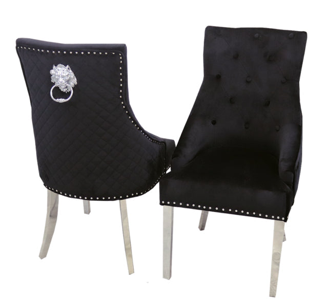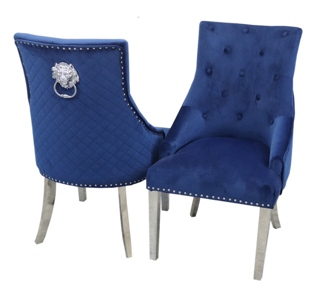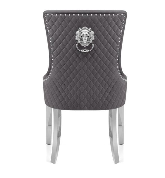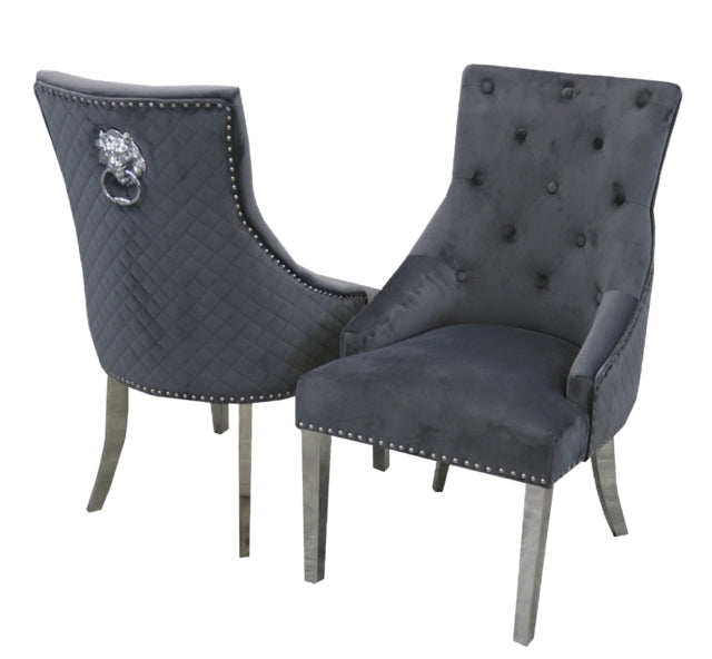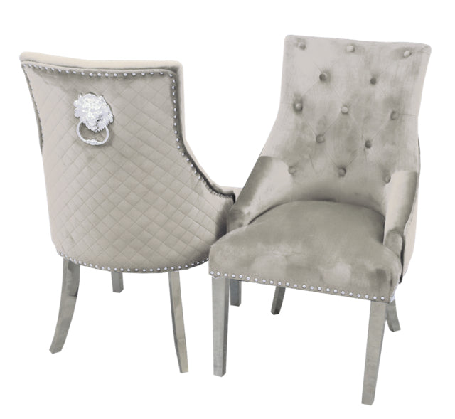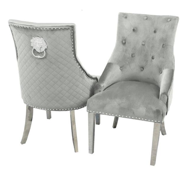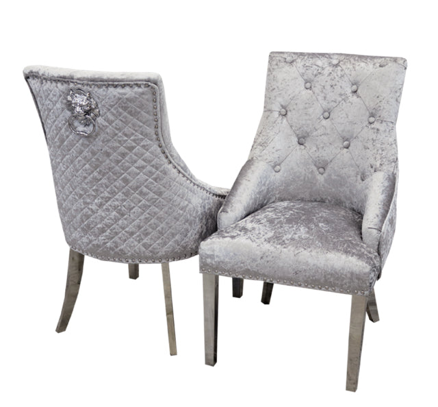 The Bentley crushed velvet armchairs are enhanced with a quilted back, chrome lion head knocker and chrome legs making them a showstopping addition to a modern dining space.