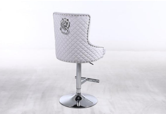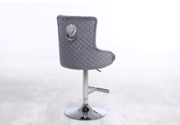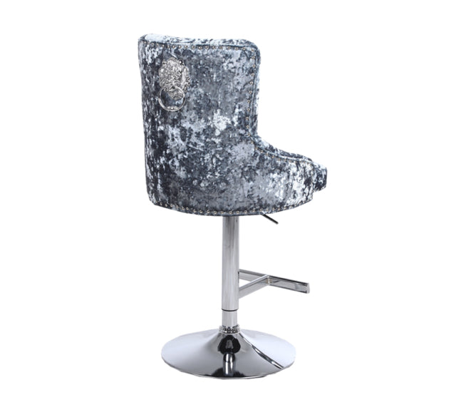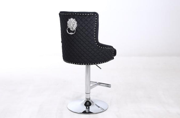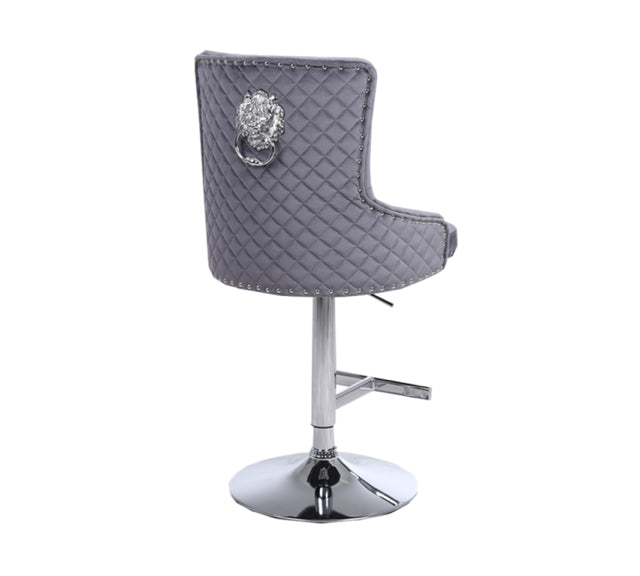 Crafted in soft velvet fabric with a chic quilted design on the back. Thanks to the chrome studded detail around the edge of the chair and the striking lion knocker design, the Bentley bar stool radiates luxury.
