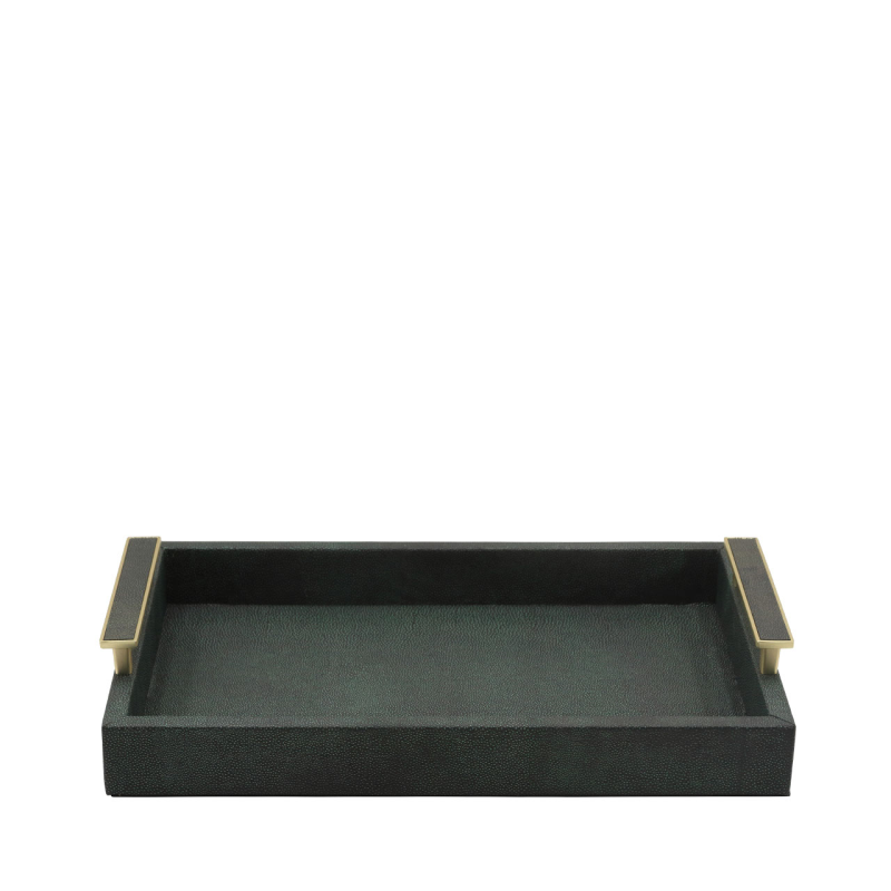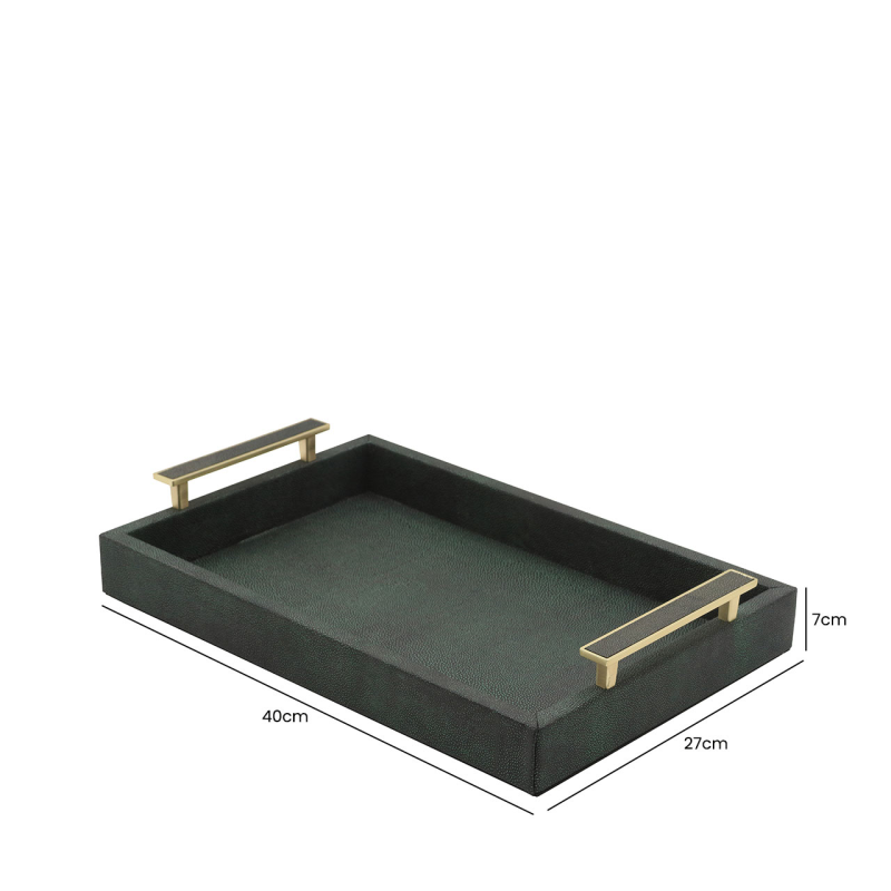 Enhance your setting with our black and green faux litchi tray. Crafted from faux leather and MDF, it features a striking gold handle. The blend of black and green, combined with the elegant gold accents, adds a touch of style and functionality to your decor and serving arrangement.
