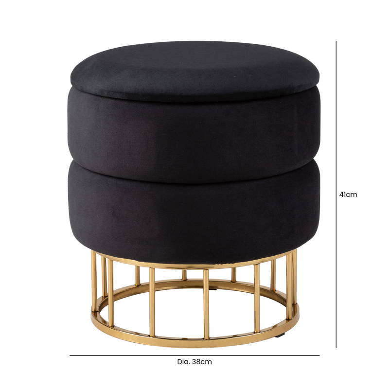 A stylish and practical addition to any living space. This versatile stool features a sleek black upholstery that adds a touch of sophistication to any room, while the gold-finished base provides a modern and luxurious look. The round shape and compact size make it a practical choice for smaller spaces, while the hidden storage compartment allows you to keep your belongings organized and out of sight.