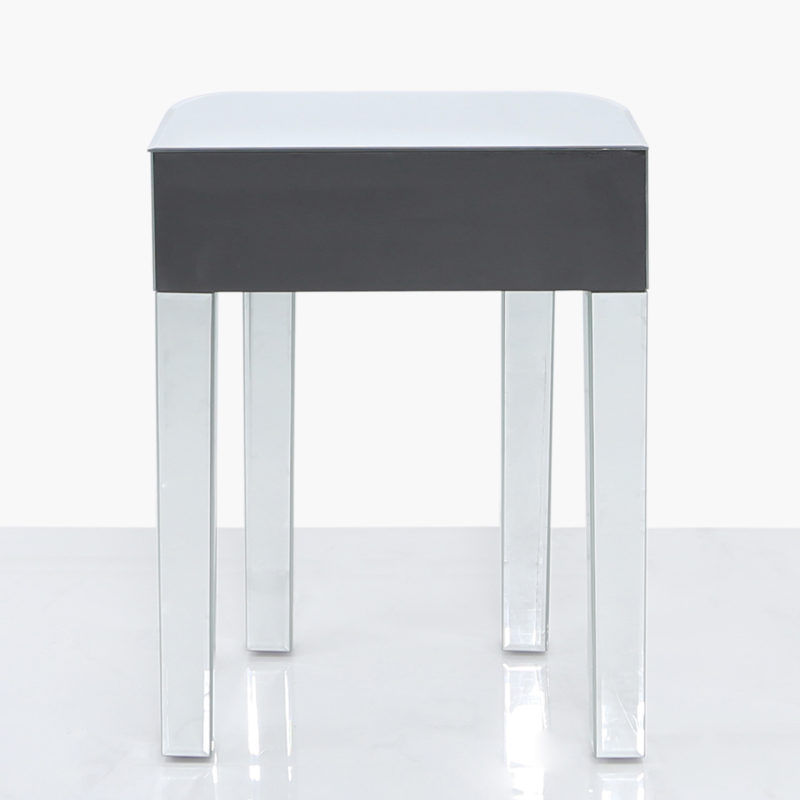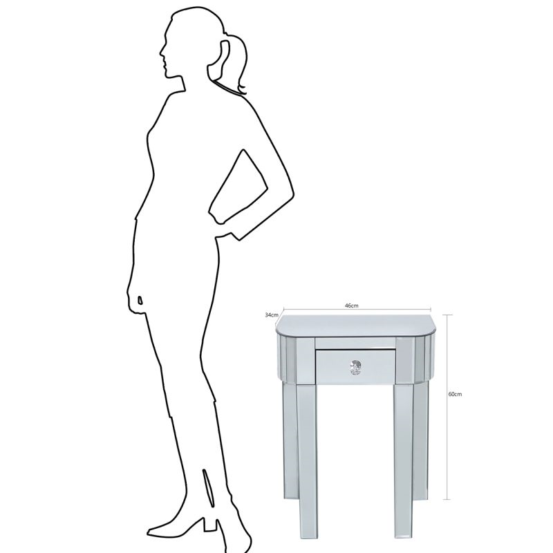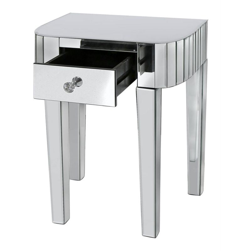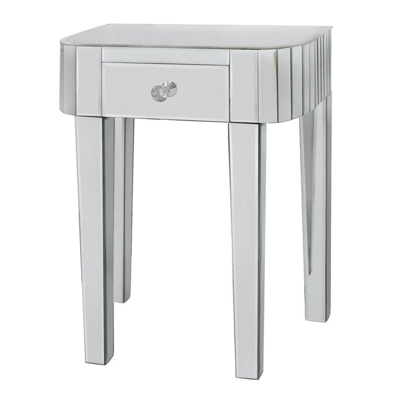 Stylish with a hint of deco, this classic mirror small end table features a draw with a crystal handle and lozenge shaped mirror side panels. This will also look perfect as a bedside/telephone table or a plant stand.