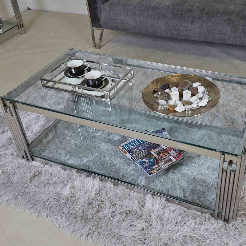 The Value Imperia Coffee Table is a cutting-edge modern design with a gorgeous stainless steel frame and a mirrored finish. This coffee table also has a cross over diamond shaped base that adds flair to the design. The table has a fitted transparent glass top that complements the table's modern look.