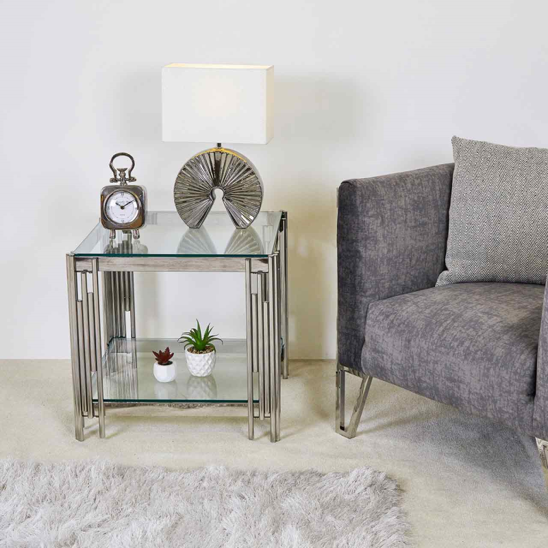 The Cohen end table features a beautiful tubular design stainless steel frame with a clear glass tabletop and a lower glass shelf. Sleek and modern , this piece is also ideal as an occasional/ bedside/end table or plant stand.