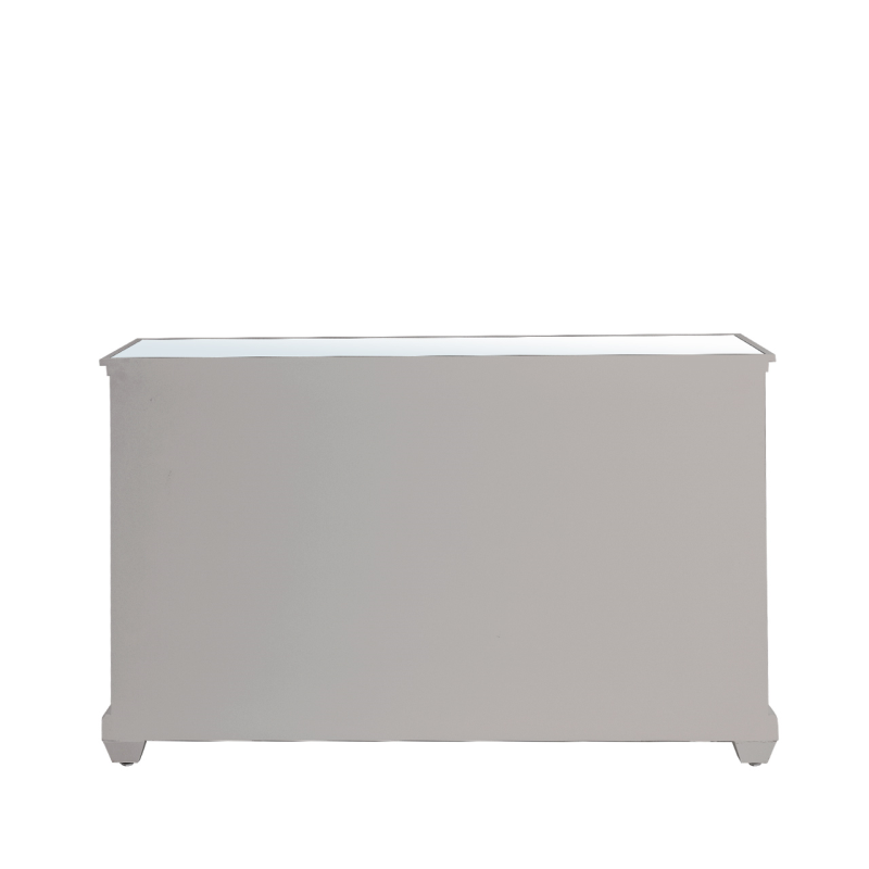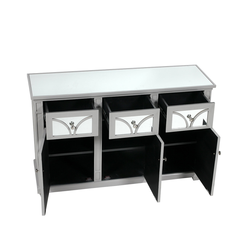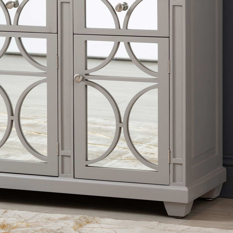 Our Torino grey wood 3-door 3-drawer sideboard is a beautiful blend of modern and traditional that will enhance the overall aesthetic of your living space. The mirrored doors and drawers are overlaid with grey gloss wood effect geometric circular panels and have exquisite metal handles.