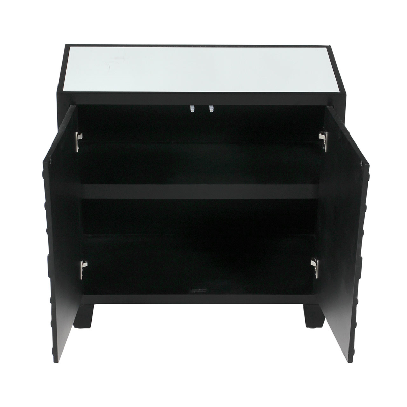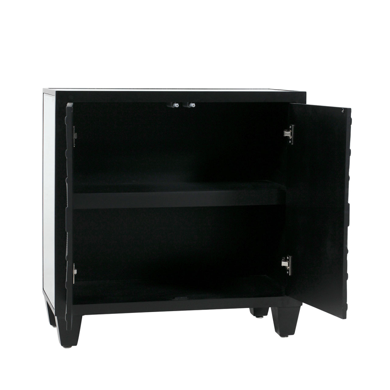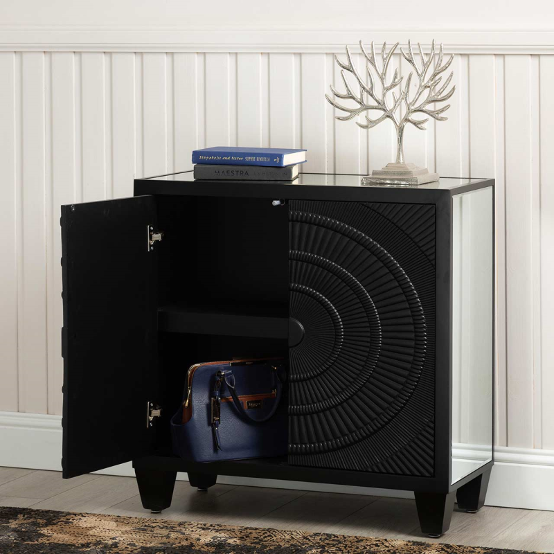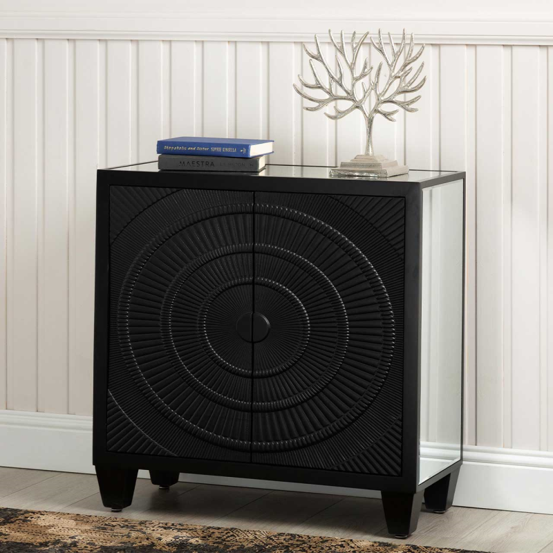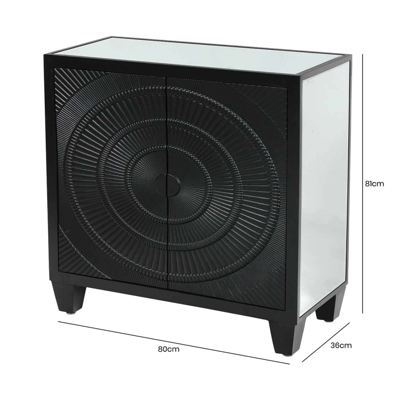 The Cirque Black two-door cabinet exudes an air of 1930s Hollywood glamour with its luscious black colour, ornate circular design and mirrored sides and top. A show stopping display and storage unit for any interior.