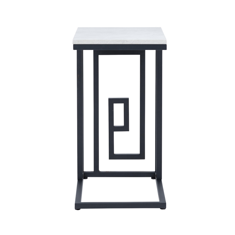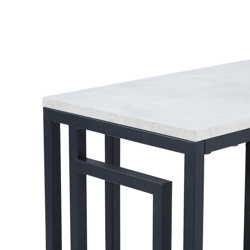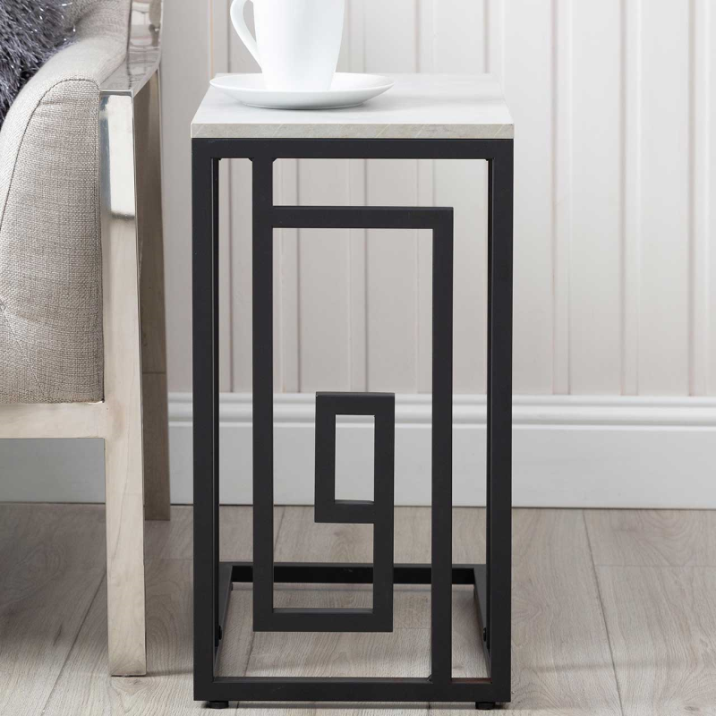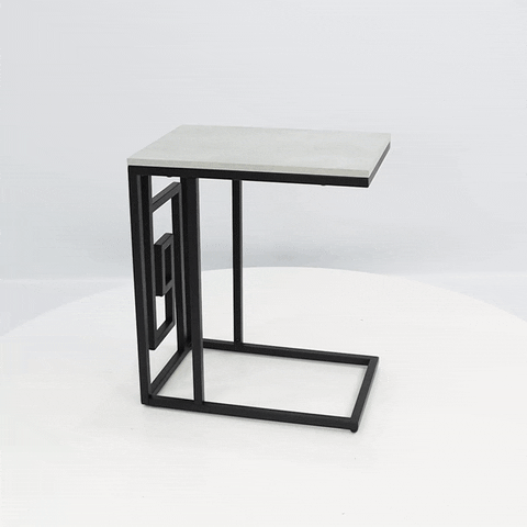 Add a crisp, modern feel to any living area with the Devon sofa table. It features a black metal frame with Grecian inspired design on the side panel, with grey wooden, faux concrete finish top.