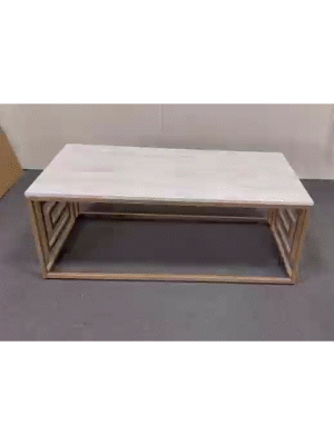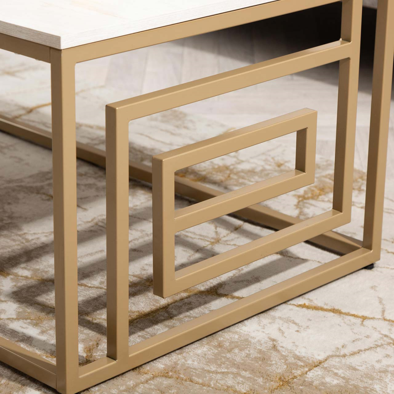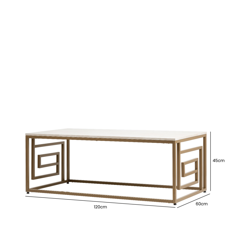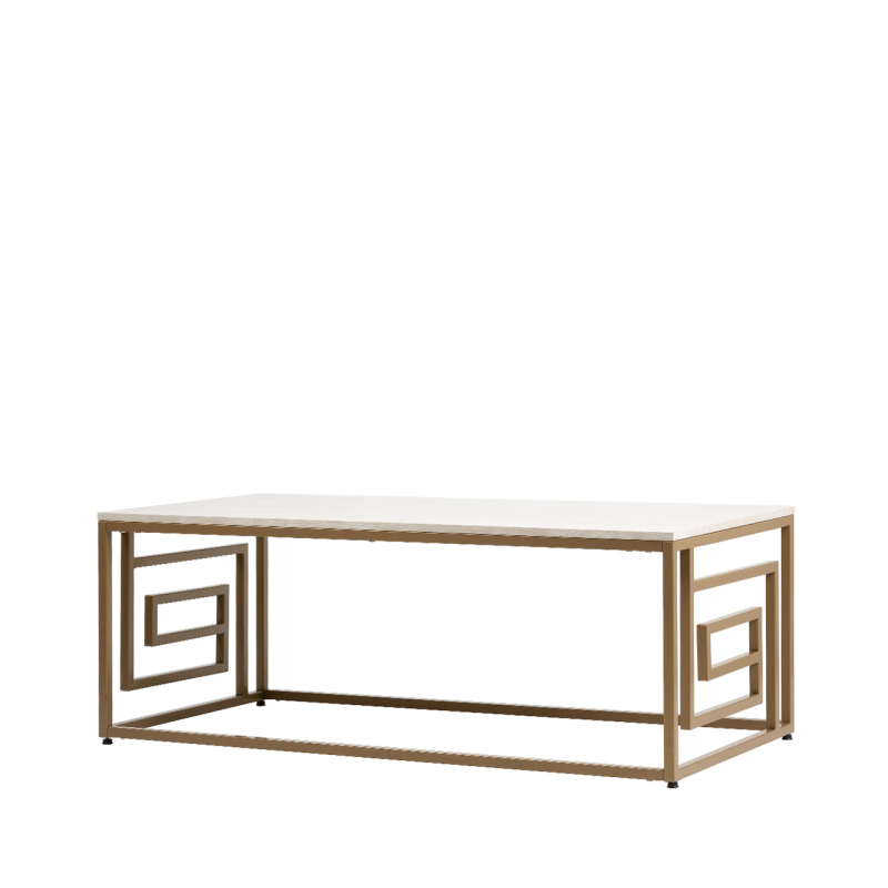 Add a crisp, modern feel to any living area with the Devi coffee table. It features a Gold metal frame with Grecian inspired design on the side panels, with Cream wooden, faux concrete finish top.