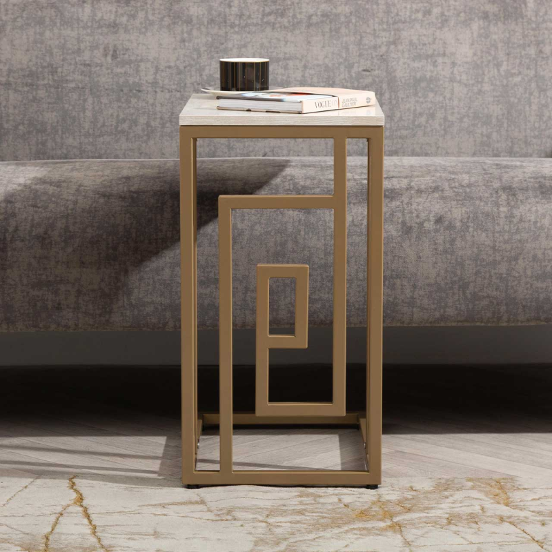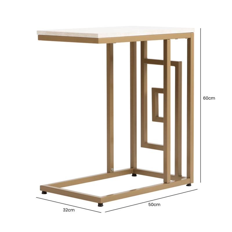 Add a crisp, modern feel to any living area with the Devon sofa table. It features a Gold metal frame with Grecian inspired design on the side panel, with Cream wooden, faux concrete finish top.