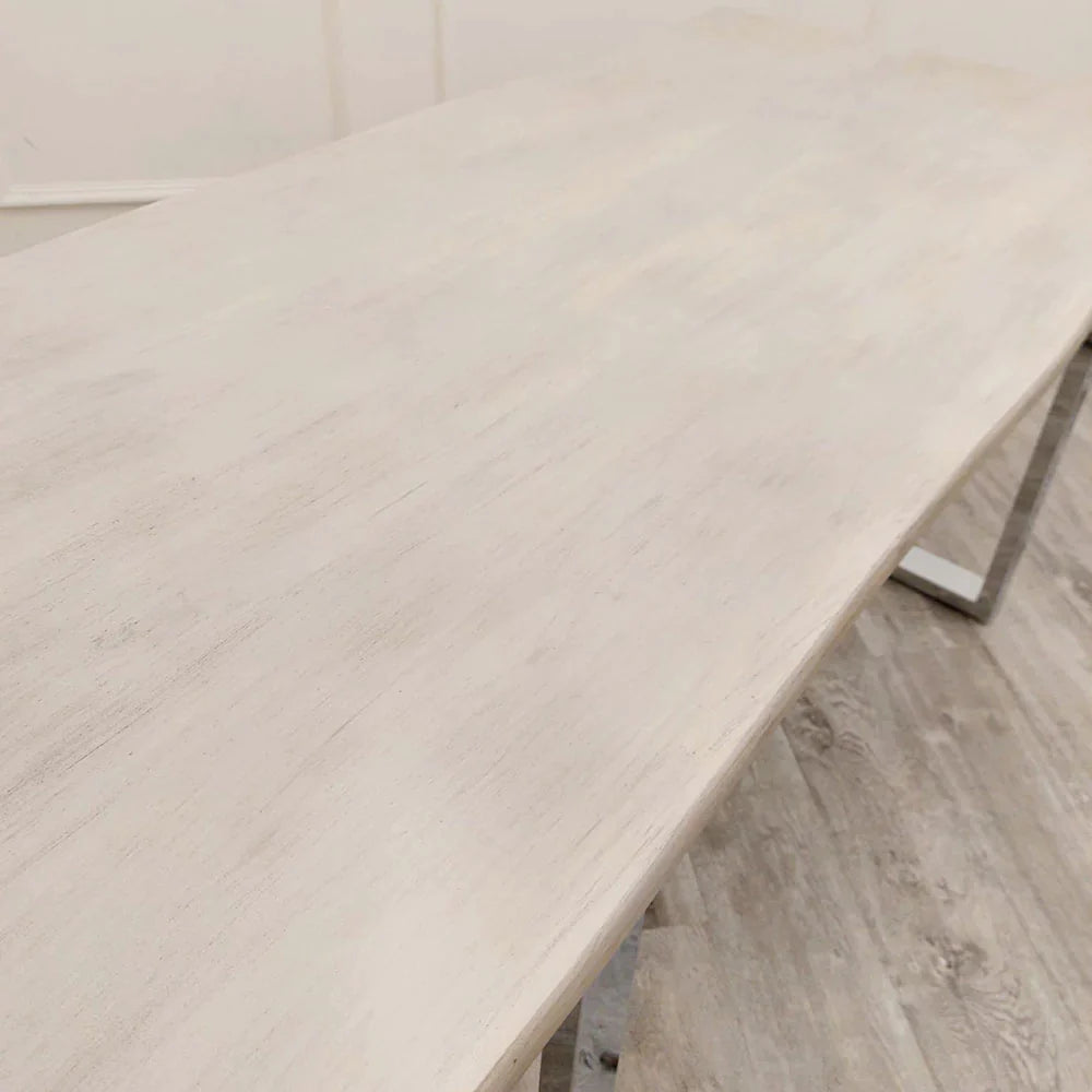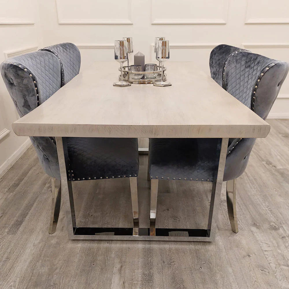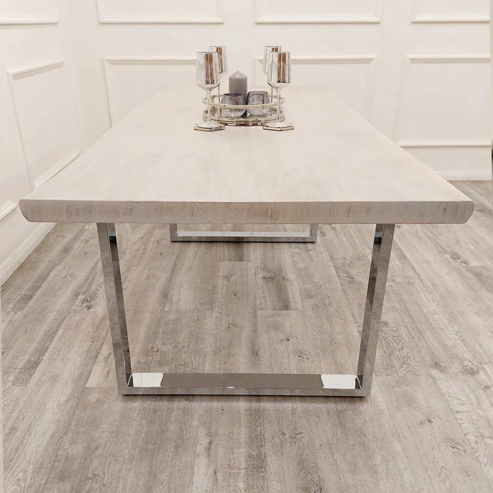 We've combined wood with our signature chrome style for our Fretta 1.8 Dining Table. A beautiful table featuring Solid Light Pine wood and Square Chrome Metal Legs.