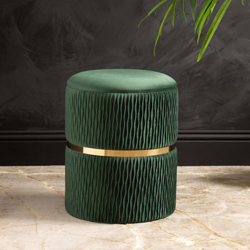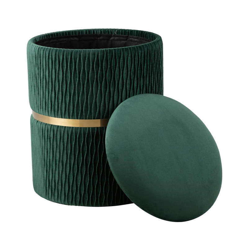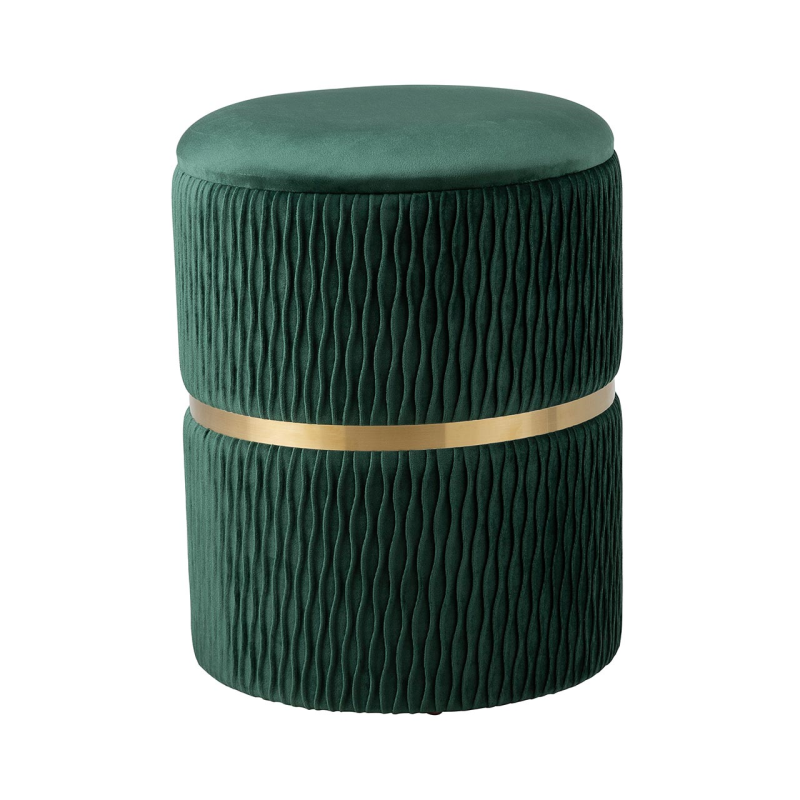 This versatile stool features a beautiful green velvet upholstery with a chic pattern that adds a touch of sophistication to any room. The gold-finished ringed design provides an opulent and elegant look, while the round shape and compact size make it a practical choice for smaller spaces.