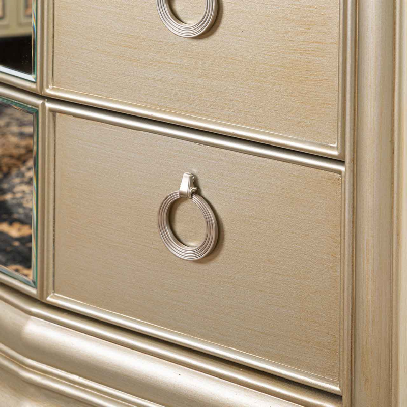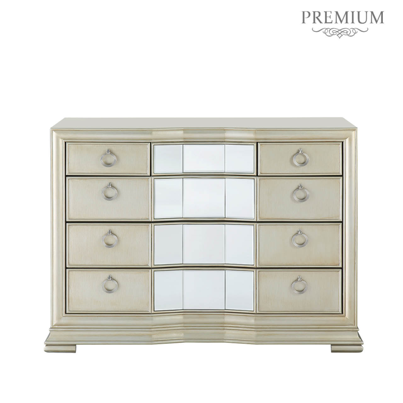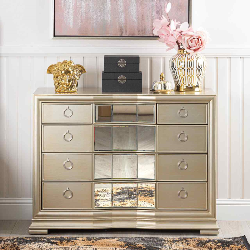 The Lucca champagne five drawer chest is a lovely addition to any living area or bedroom. The serpentine detail of the frame is created by the softly curving champagne-coloured with insets of mirror making it ideal for a contemporary home.