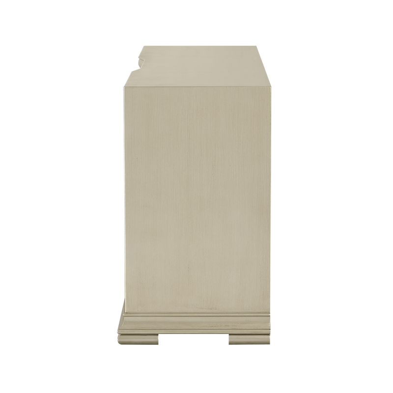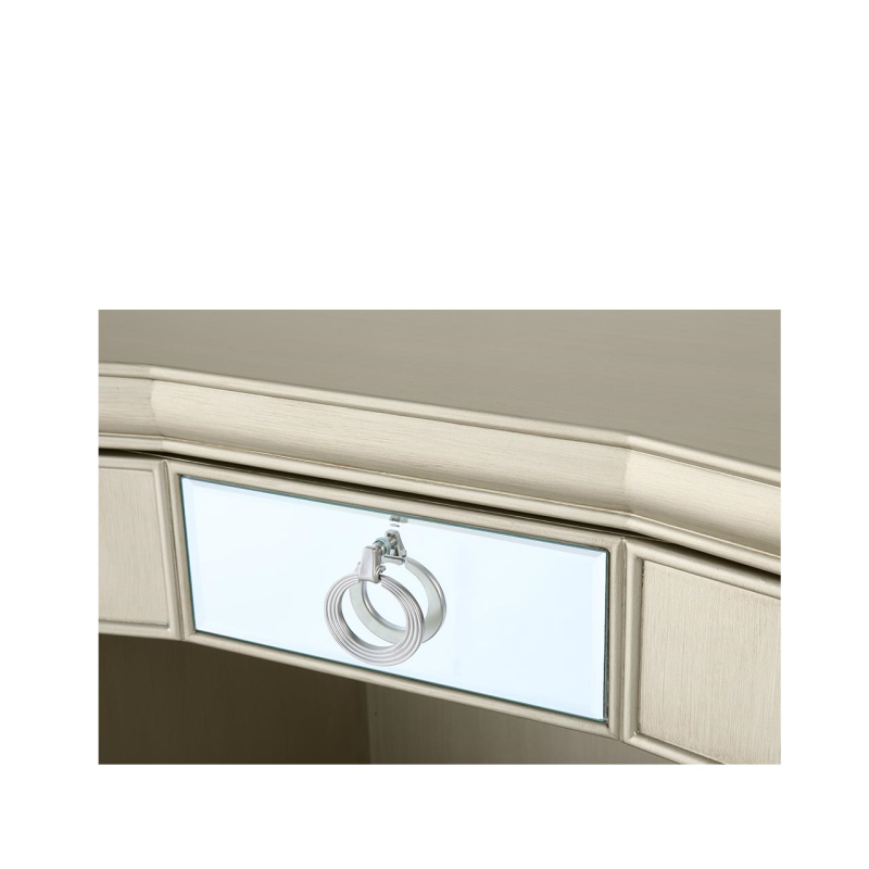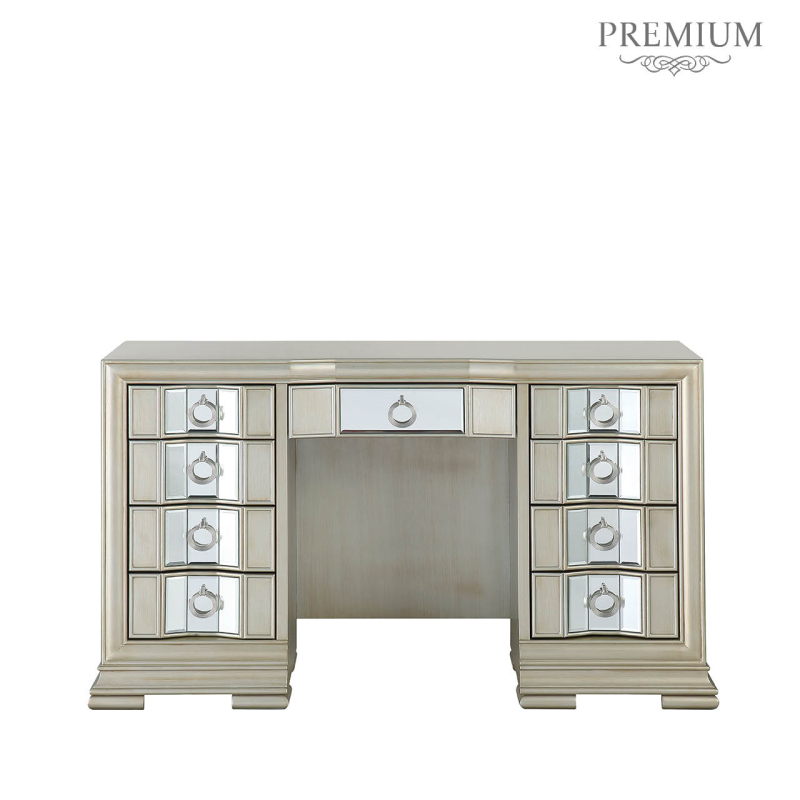 The Lucca champagne dressing table is a large and striking statement piece. The serpentine detail of the frame is created by the softly curving champagne-coloured with insets of mirror making it ideal for a contemporary home. With its ample work top and 9 drawers, this would be equally fabulous as a writing desk or workstation.