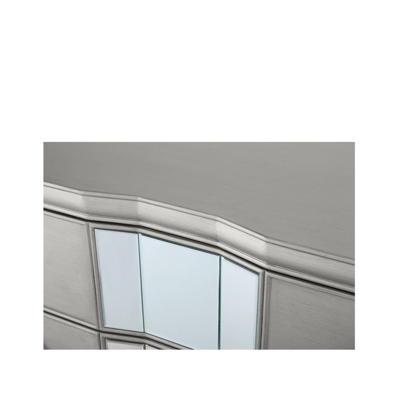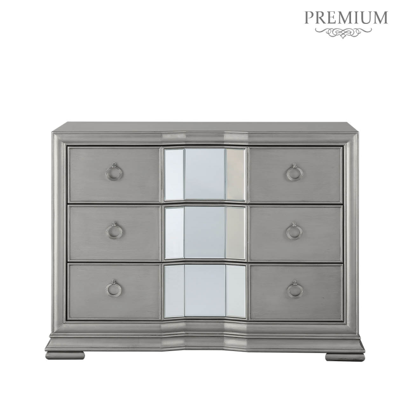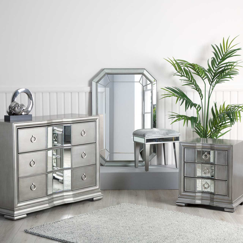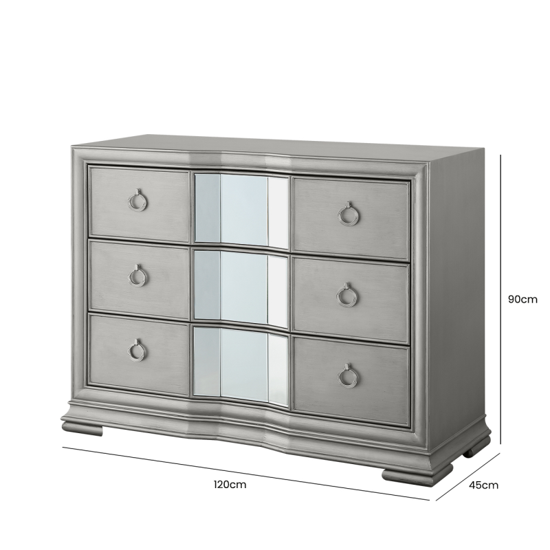The Lucca champagne three drawer chest is a lovely addition to any living area or bedroom. The serpentine detail of the frame is created by the softly curving champagne-coloured with insets of mirror making it ideal for a contemporary home.