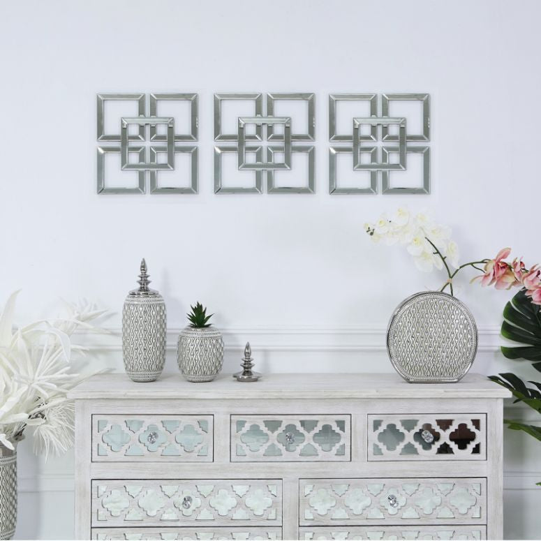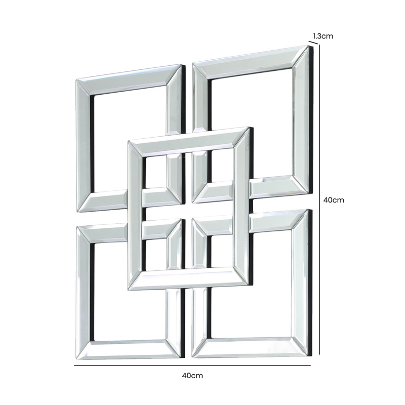 Enhance your living space with this small Manhattan geometric mirror wall art. This decorative piece features 4 clear mirrored frames with a conjoined square mirror frame in the middle. Use individually or group any number together to reflect light and create a unique and eye-catching pattern.