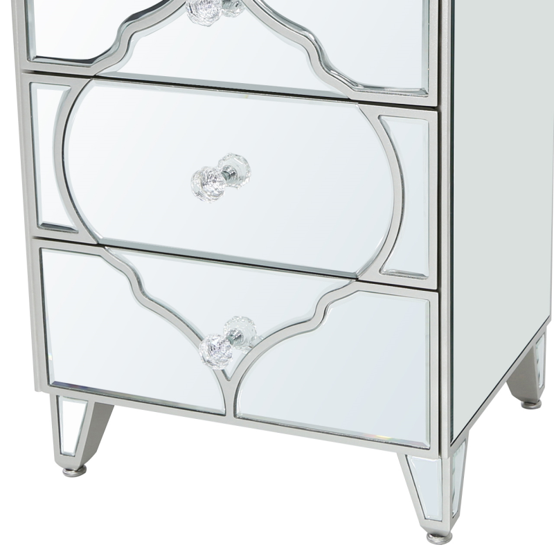 Stunningly elegant furniture inspired by the ornate glitz of Morocco that brings a touch of class to any living space or bedroom. The Marrakech 3 drawer bedside cabinet features mirrored panelling throughout, 3 storage drawers with a frosted mirror quatrefoil design and elegant silver trim.