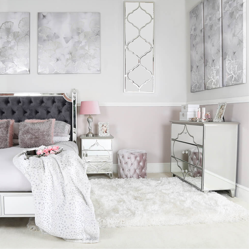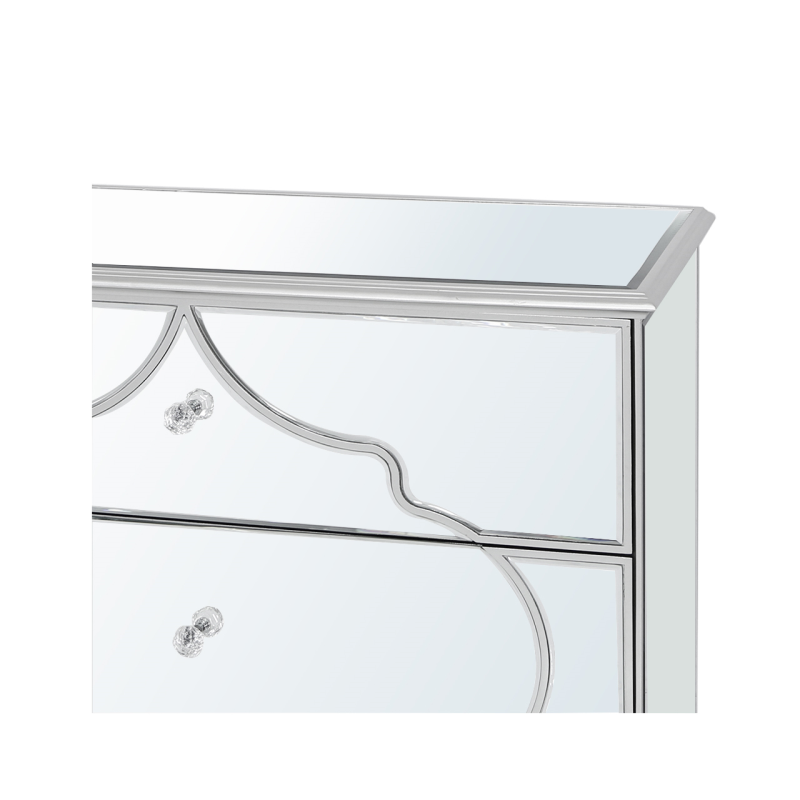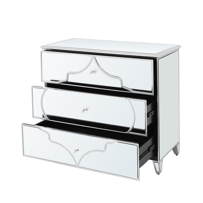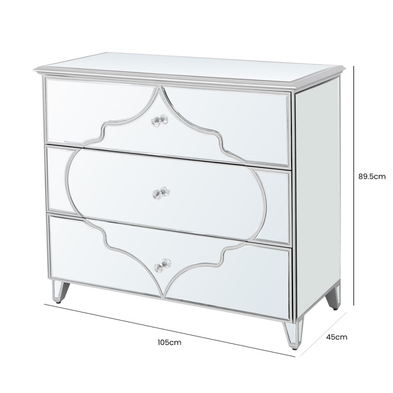 Lavish and lovely furniture inspired by the ornate glitz of Morocco that will bring a touch of class to any living space or bedroom. The Marrakech 3 drawer chest features a spacious drawer with crystal handles, elegant silver trim and a stunning quatrefoil frosted mirror design.