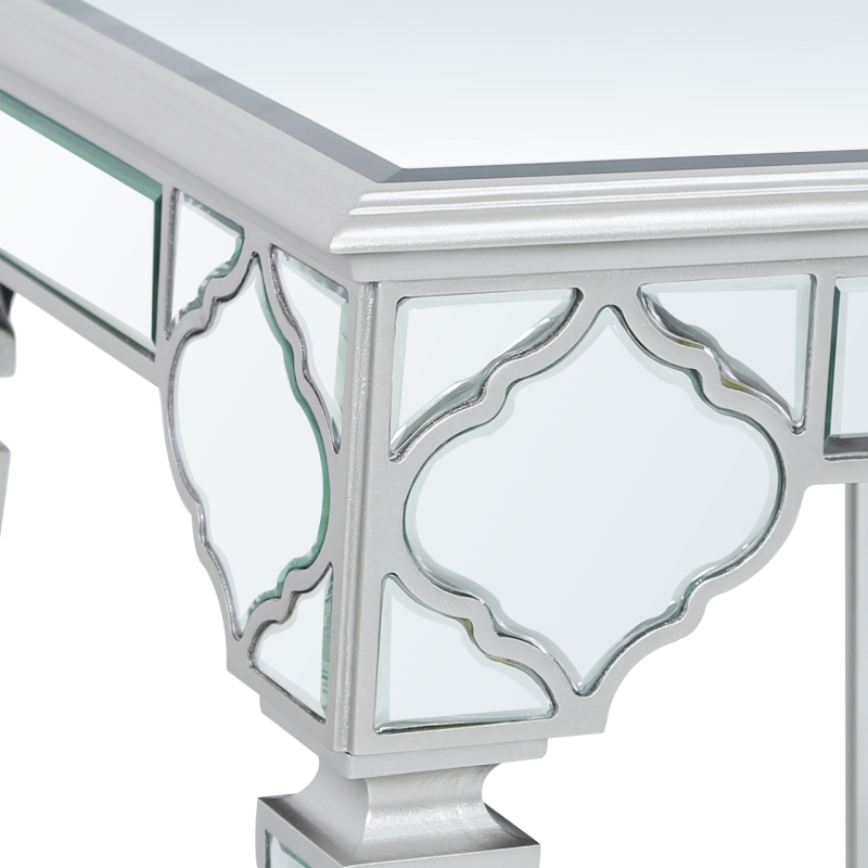 This stunningly elegant furniture is inspired by the ornate glitz of Morocco. Fill any empty corner or room space with the Marrakech mirror end table which features mirrored panels throughout, silver trim and a frosted mirror quatrefoil design on the sides. An occasional table perfect as lamp, sofa, bedside and display table.