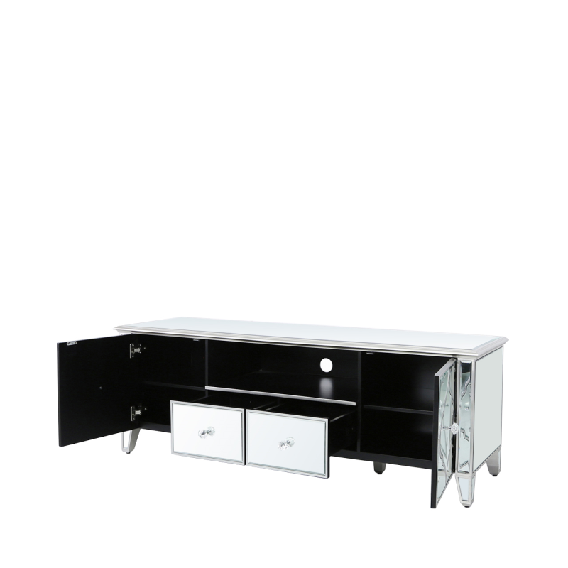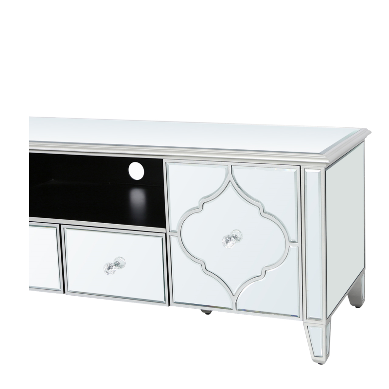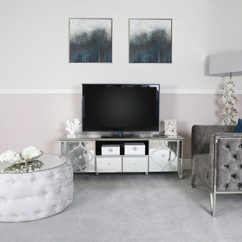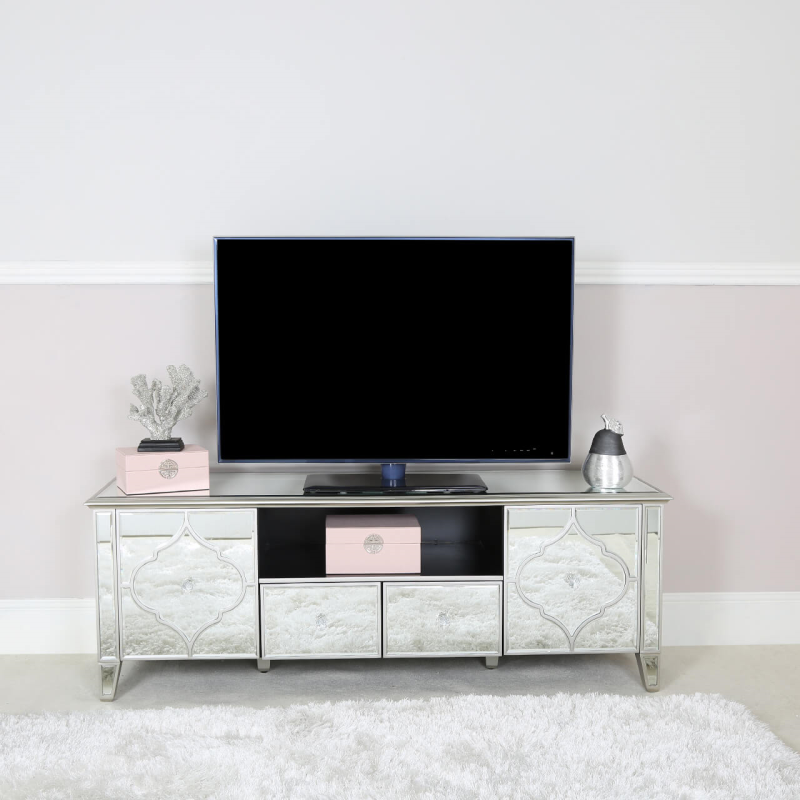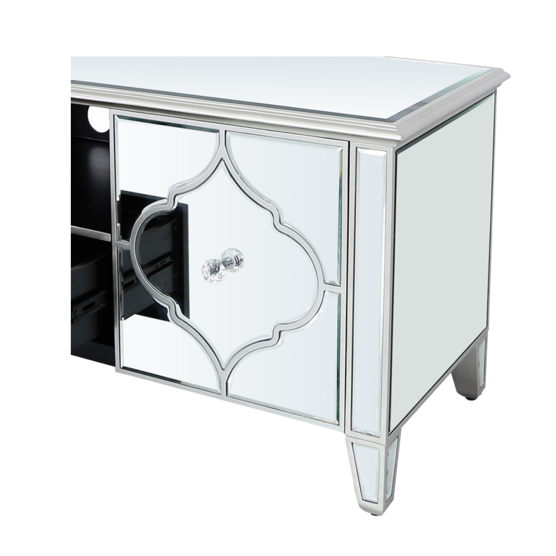 This stunningly elegant furniture is inspired by the ornate glitz of Morocco that brings a touch of class to any living space. The luxurious Marrakech mirrored TV stand & entertainment unit will liven up your entertaining space, providing ample space for your visual, gaming and audio equipment. This piece featues mirrored panelling throughout, 2 ample drawers and 2 generous storage cupboards with frosted mirror quatrefoil designs and elegant silver trim. The unit is ompleted with crystal handles and a cable management port.