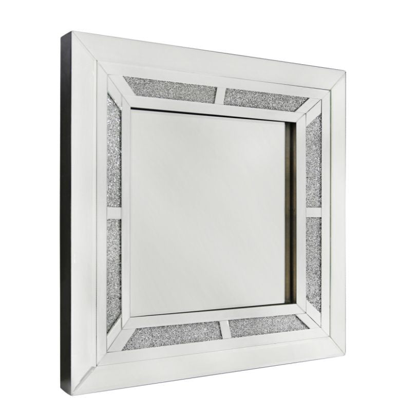 Adorn your walls with the Milano 60cm square wall mirror featuring a glamourous frame inlaid with with strips of tiny mirror and clear crystalse .