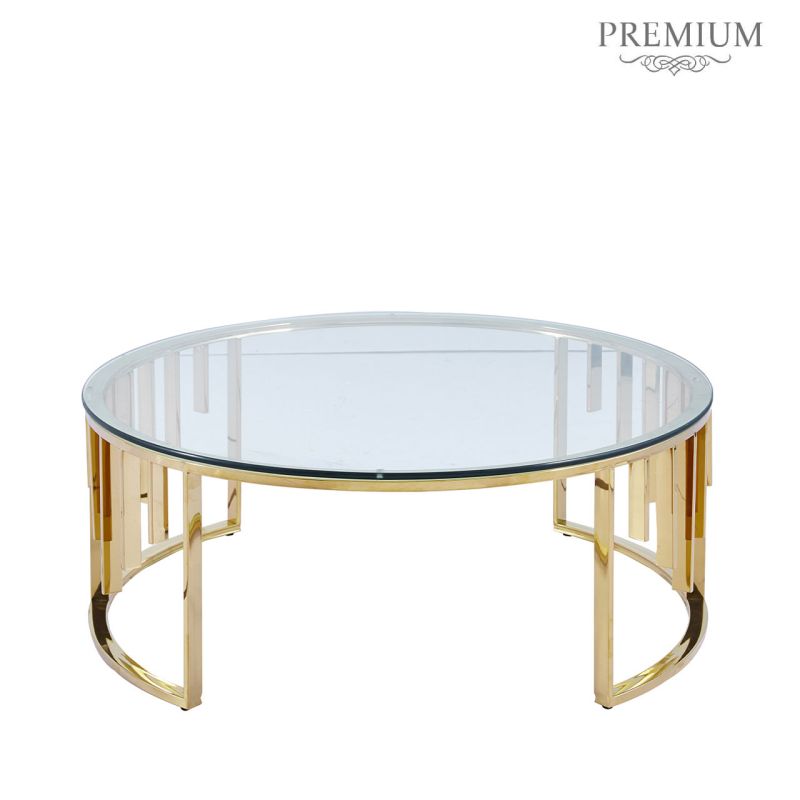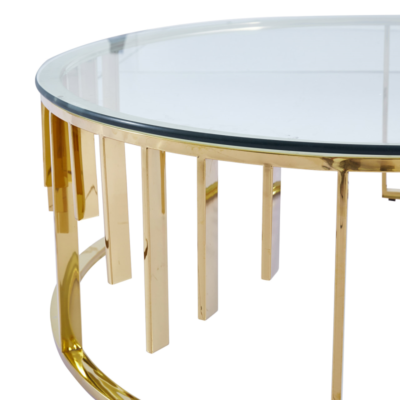 "The Osen Round Gold Metal Coffee Table with a Clear Glass Top. Immerse yourself in elegance with this stunning piece. Crafted from premium stainless steel, its lustrous gold finish adds a touch of luxury to any space. The tempered glass top not only enhances its beauty but also provides a smooth surface for your coffee or decorative items. Its round shape and sleek design make it a versatile addition to both modern and traditional settings. With its sturdy construction and timeless appeal, this coffee table is a perfect blend of style and functionality. Elevate your living area with the Osen Coffee Table and indulge in sophistication and refinement.
