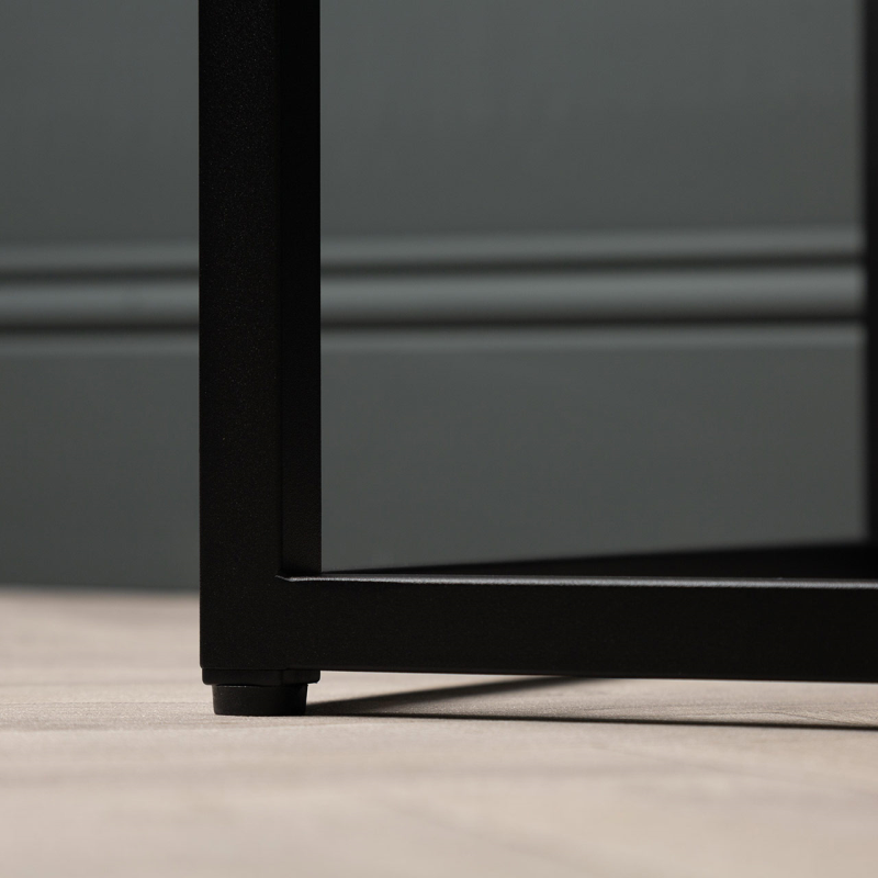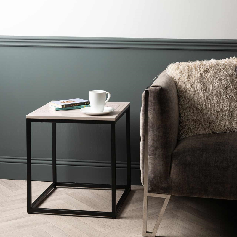 Inject a splash of industrial chic to your interior with the Page end table. It features a classic black metal frame with a striking grey wooden, linear patterned top. This versatile piece is also ideal as a lamp/occasional/bedside/display table