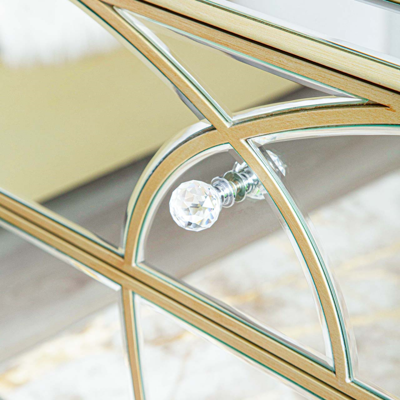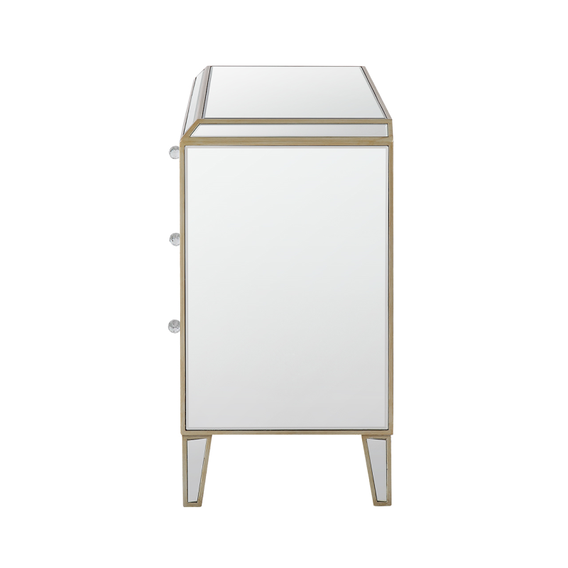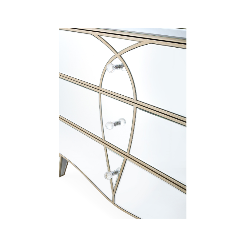 The Pristina 3 drawer chest will bring a touch of refinement to any room. It features mirror panels with champagne trim and drawer detailing. Crystal handles on the drawers, gently curved bottom edge and tapered legs complete this elegant piece. .
