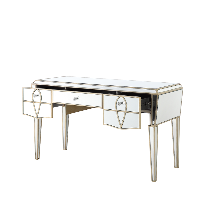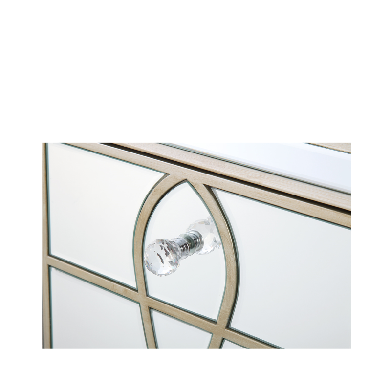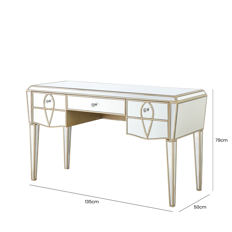 The Pristina 3 drawer dressing table will bring a touch of refinement to any room. It features mirror panels with champagne trim and drawer detailing. Crystal handles on the drawers, gently curved edges and tapered legs complete this elegant piece which would work equally well as a writing desk or workstation.