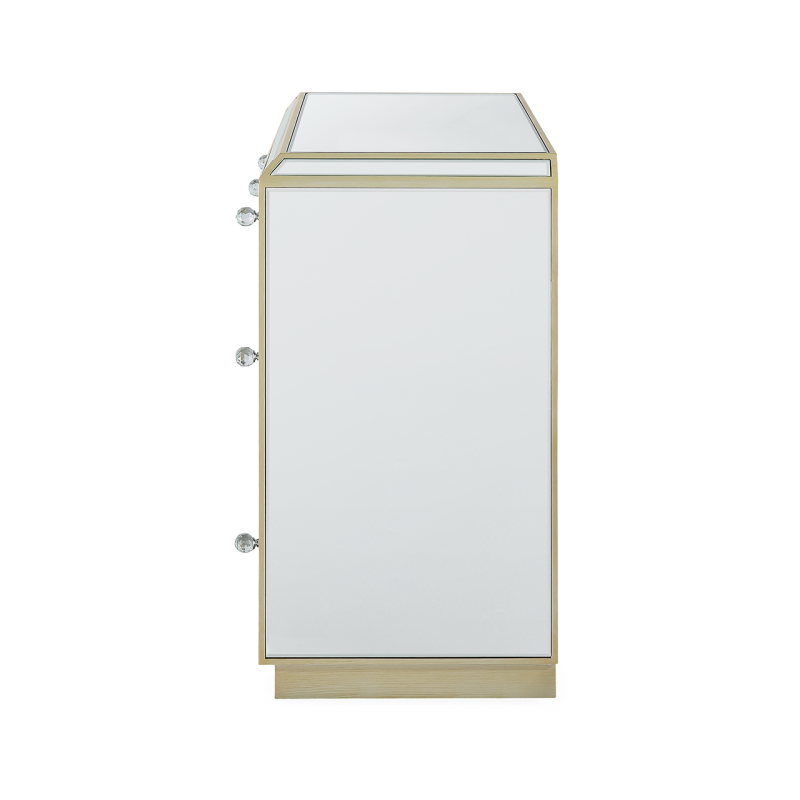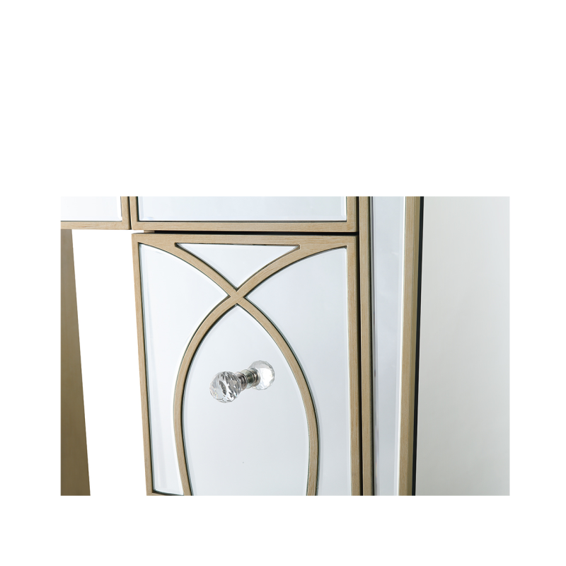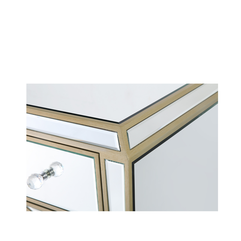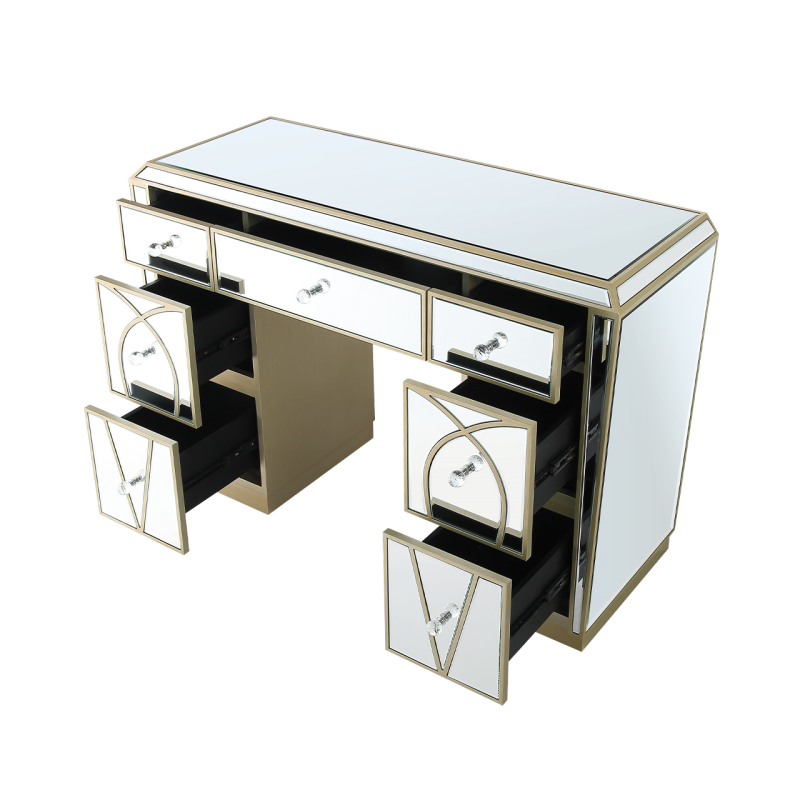 The Pristina 7 drawer dressing table will bring a touch of refinement to any room. It features mirror panels with champagne trim and drawer detailing. Crystal handles on the drawers complete this elegant piece which would work equally well as a writing desk or workstation.