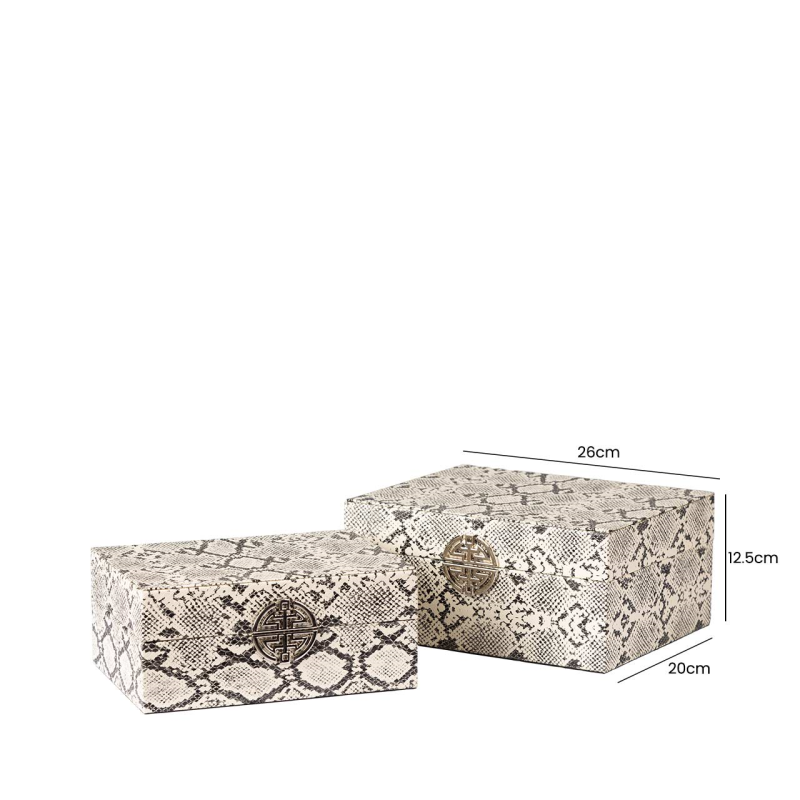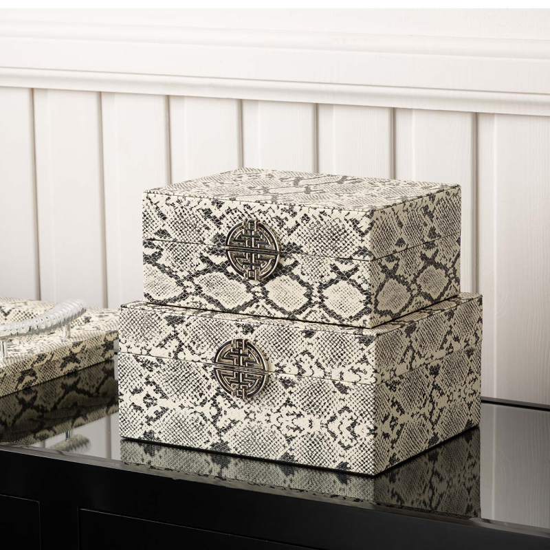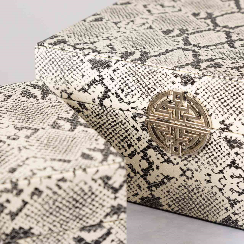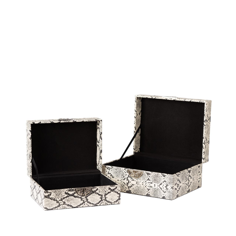 This set of two black and white faux snakeskin leather boxes are made of wood covered with faux leather and features chrome geometric clasps to give an understated, elegant look and provide plenty of designated storage space for your jewellery .