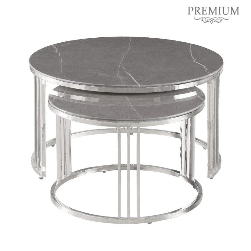 Set of 2 Chrome Metal Coffee Table with Grey Marble Design Glass Top Coffee Table
